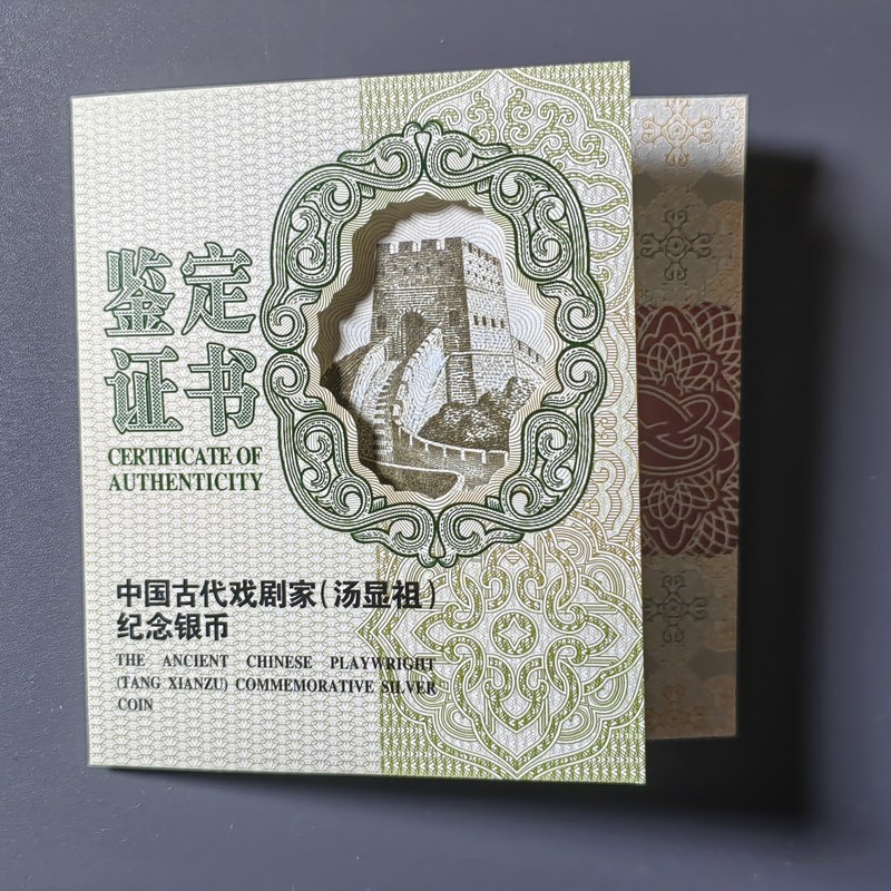 中国古代戏剧家——汤显祖 纪念银币30克,中国人民银行发行,带证书和原盒。发行量:3万枚。