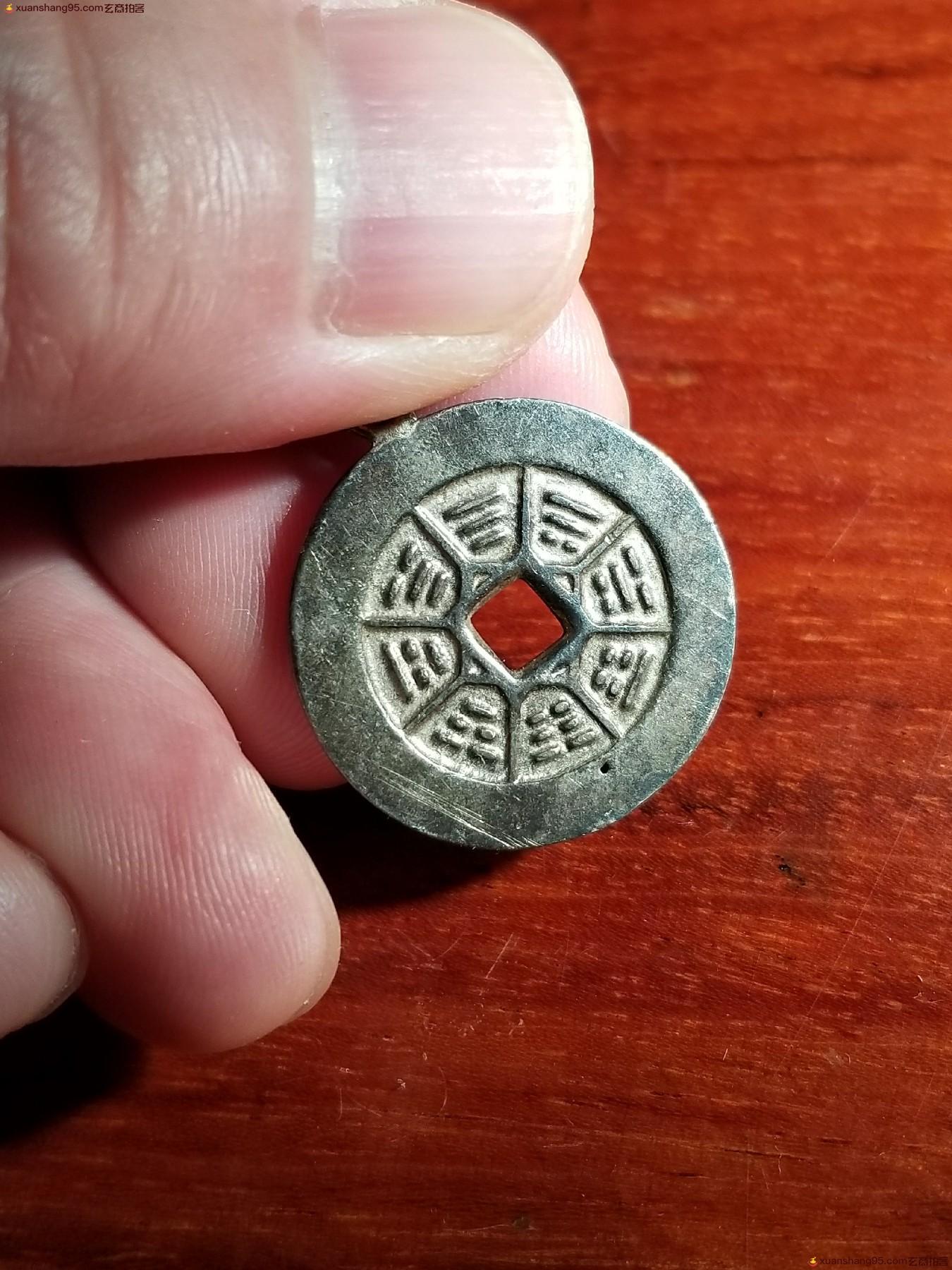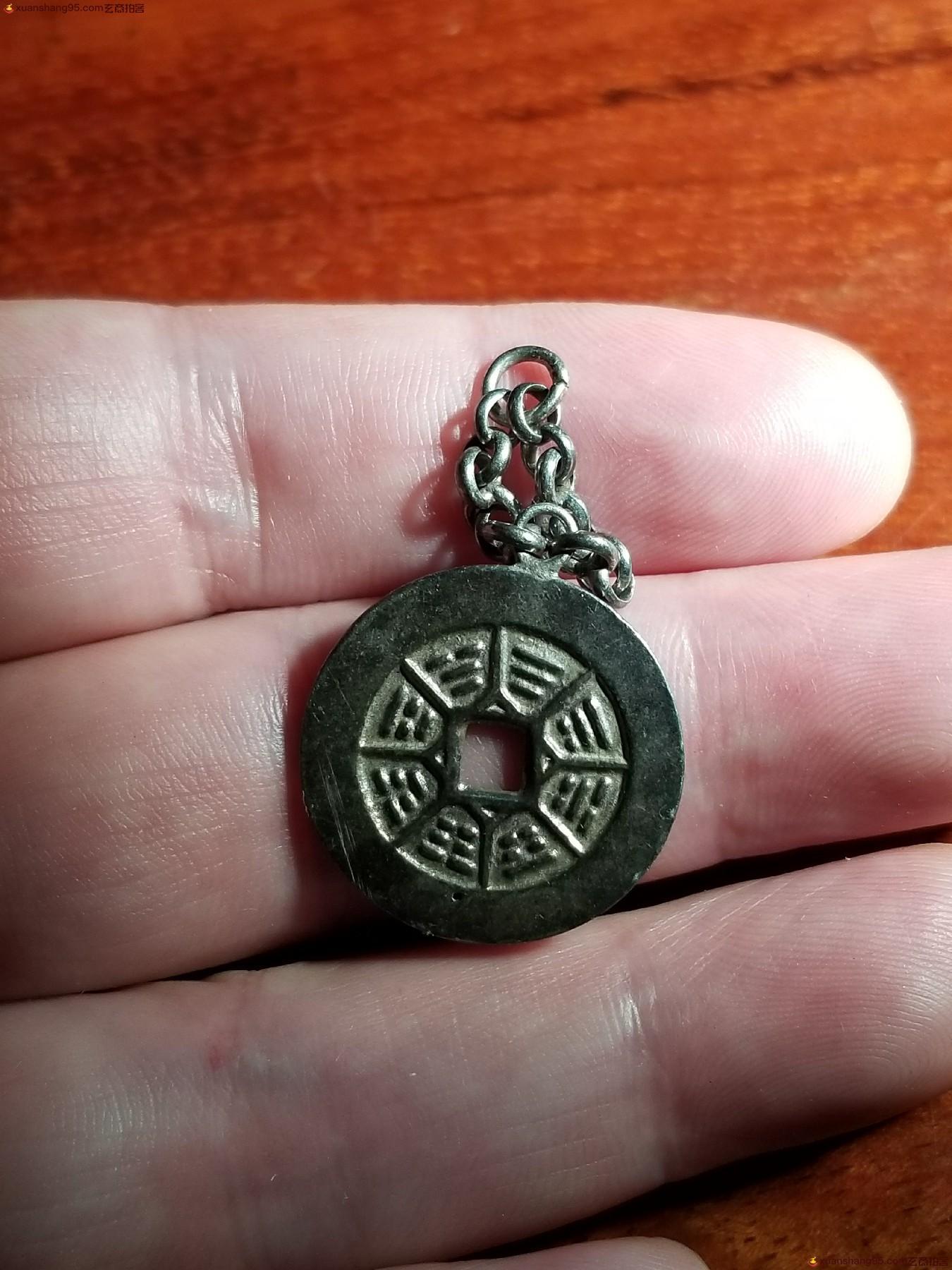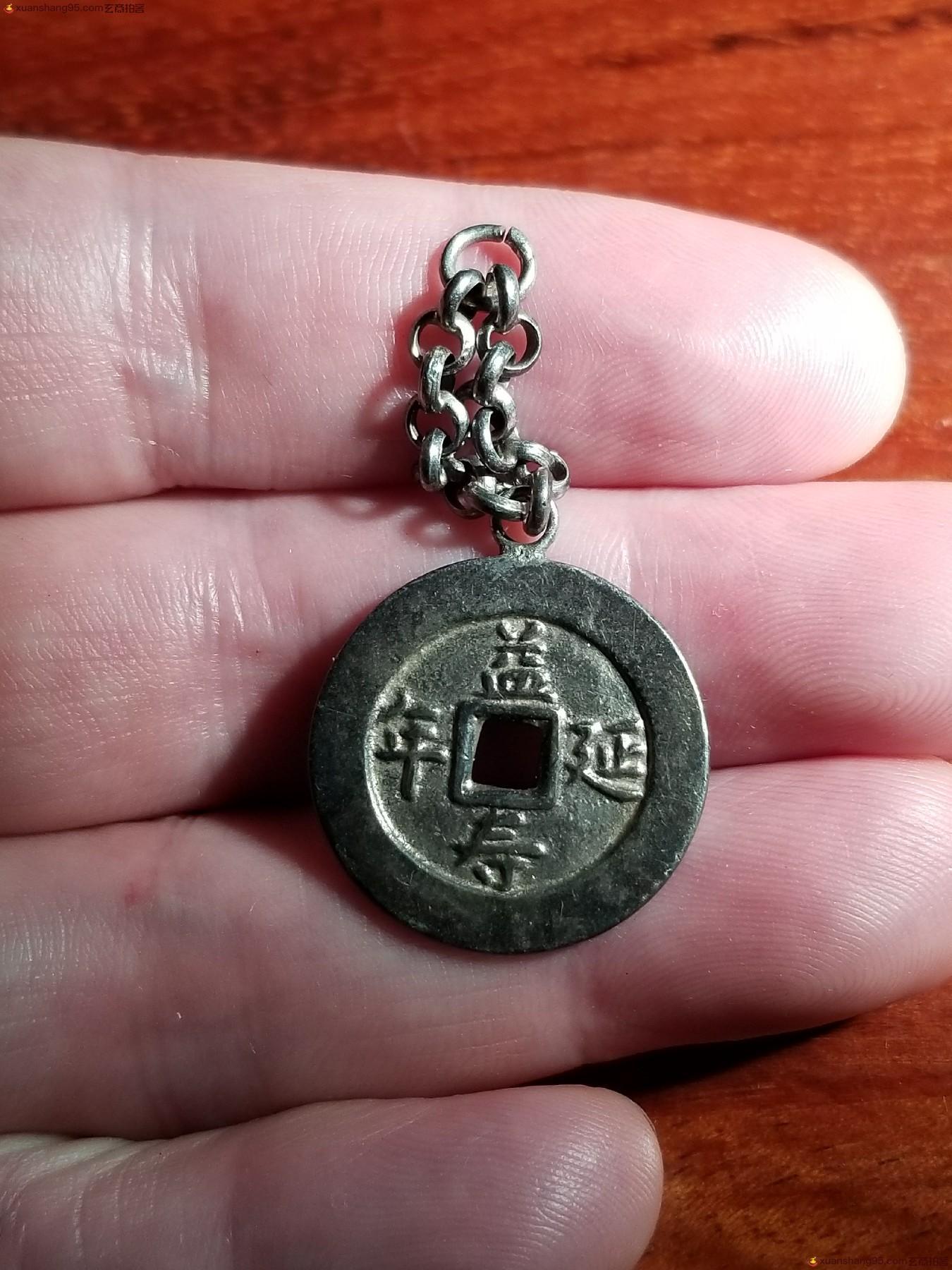 这枚银质“延年益寿”背八卦花钱带有原配的银链,是民国年间与高档怀表配套使用的。与普通银质花钱不同的是这枚含银量高,且非常厚实,外缘及内穿都非常规矩,可以肯定乃著名银楼所制。 延年益寿背八卦除了祝愿长寿健康之外还有调和阴阳五行之用,当代人不用怀表了,但可以配手机或钱包,感觉品味顿然提升了。