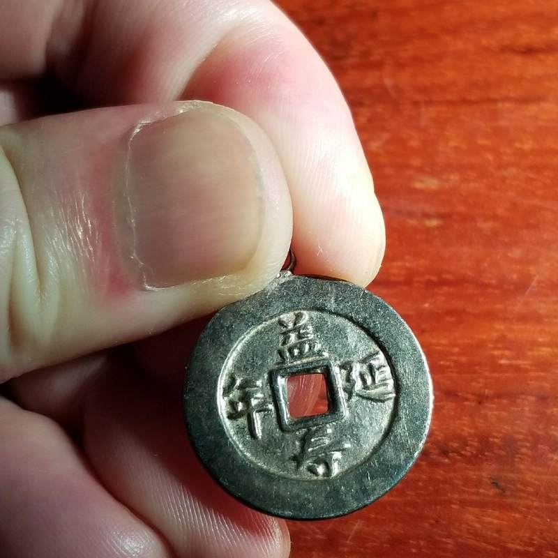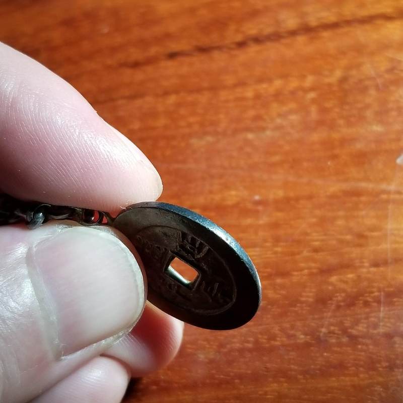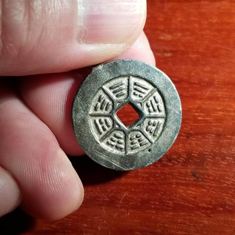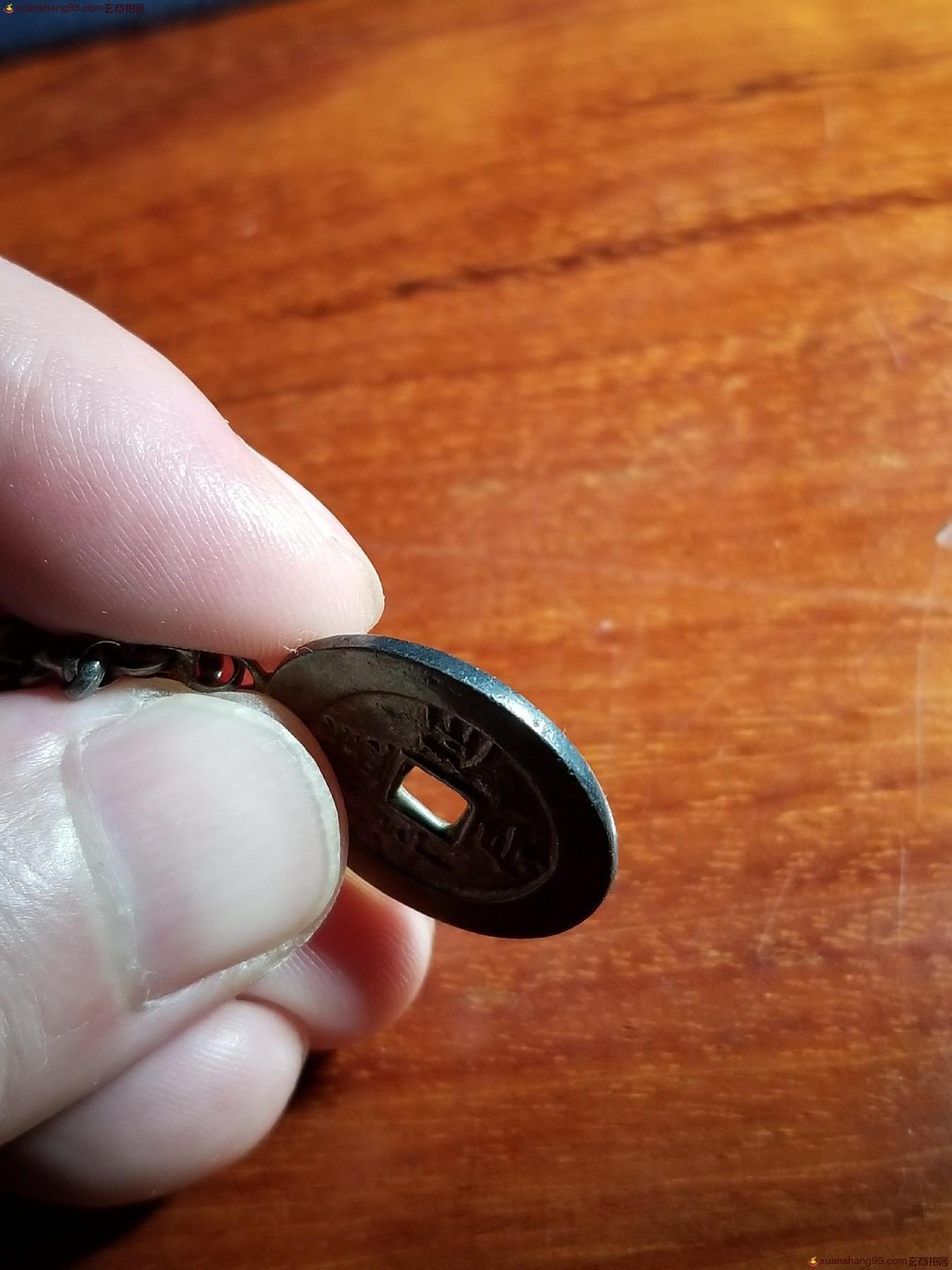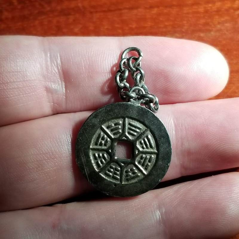 这枚银质“延年益寿”背八卦花钱带有原配的银链,是民国年间与高档怀表配套使用的。与普通银质花钱不同的是这枚含银量高,且非常厚实,外缘及内穿都非常规矩,可以肯定乃著名银楼所制。 延年益寿背八卦除了祝愿长寿健康之外还有调和阴阳五行之用,当代人不用怀表了,但可以配手机或钱包,感觉品味顿然提升了。