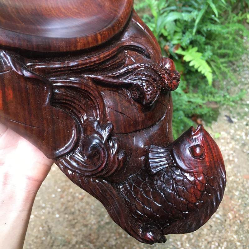 老挝大红酸枝 年年有鱼 果盘,带水波,全实心板料,整料立体深挖雕刻而成,造型漂亮,无瑕疵,精品,长34.5cm,宽17cm,高6cm,重2.46斤。