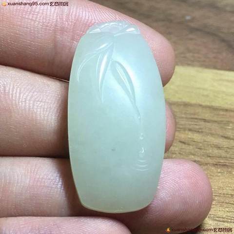 宝贝玉质细腻温润 带有少许青花 整体形状匀称饱满 雕刻雨后竹叶滴水的画面立体感强 意境美好富有诗意