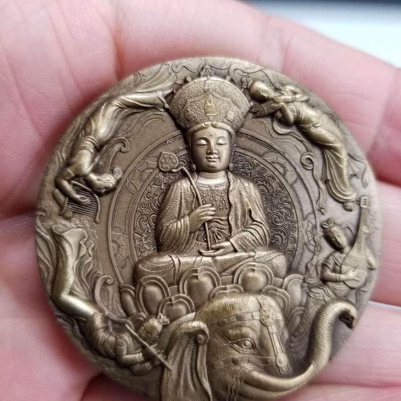 “峨眉山”铜章由沈阳造币有限公司铸造面世,正面图案为万年寺宋代普贤骑象圣像为主,以殿顶飞天壁画为背景内容:背面图案是峨眉山金顶全景映衬菩萨手持如意。