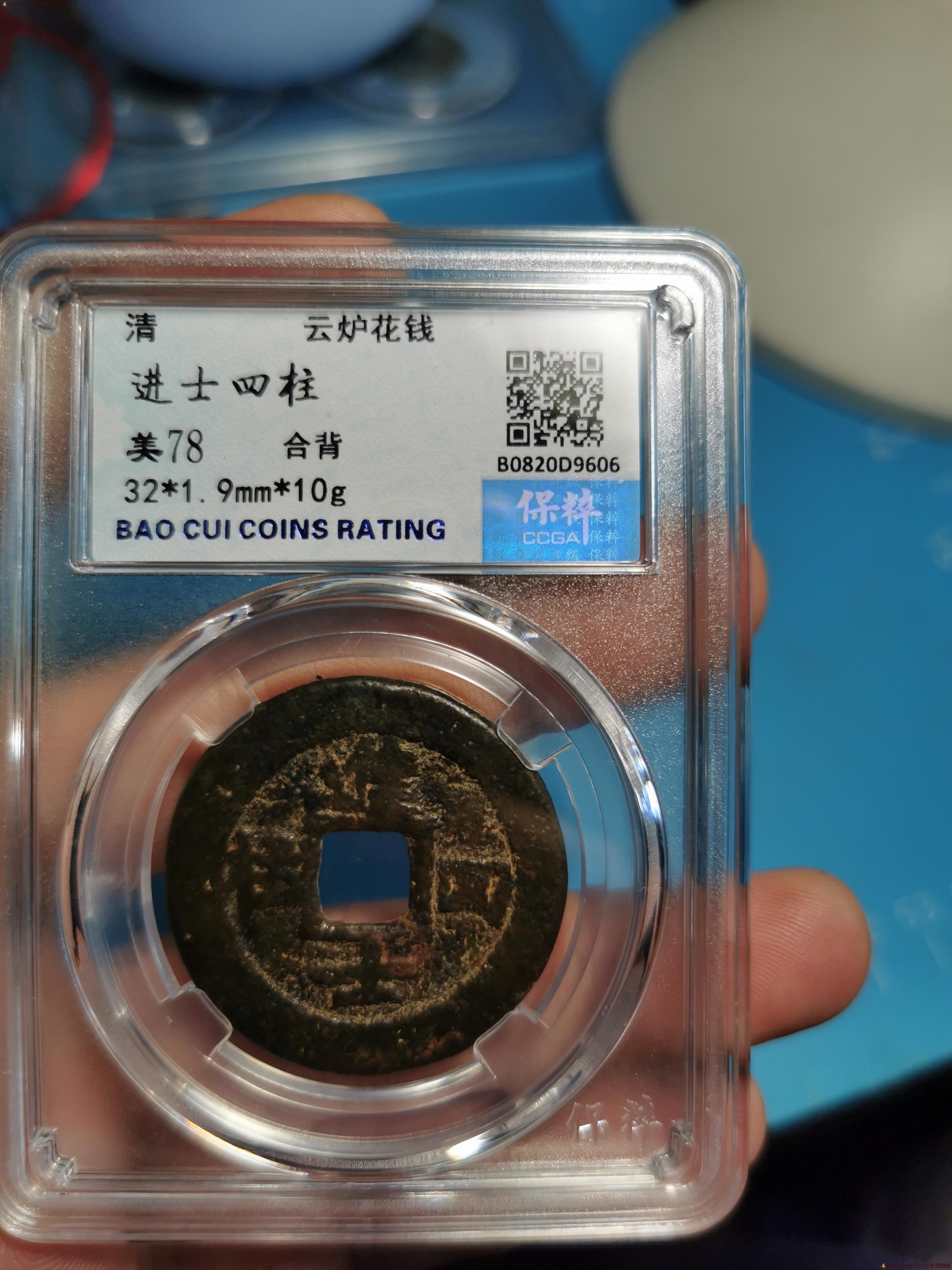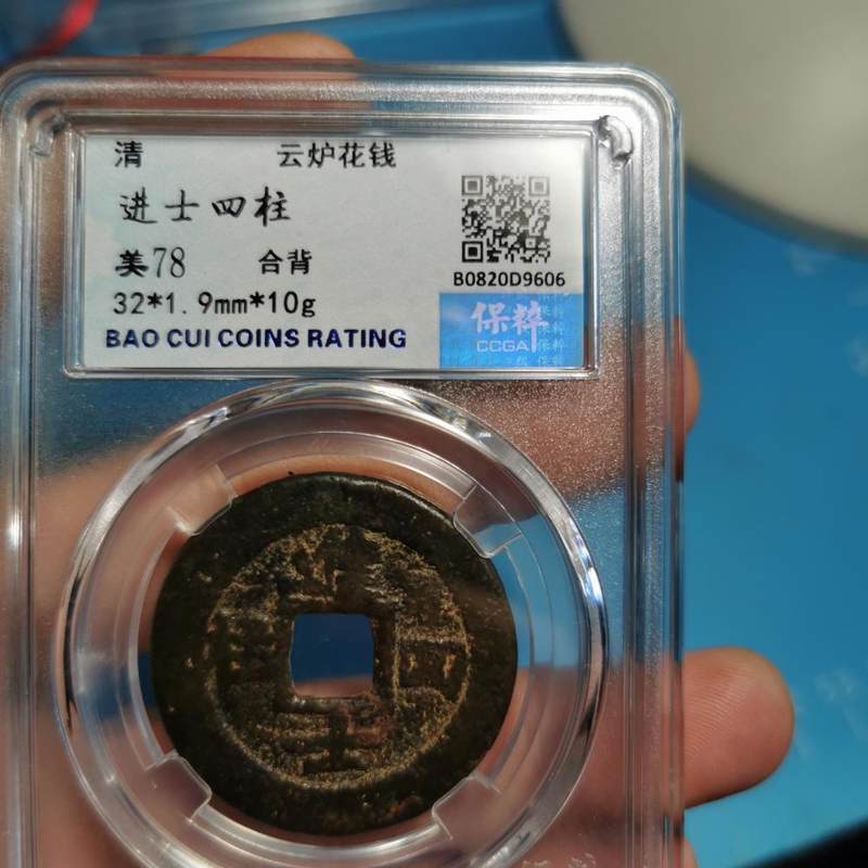 图录号41清 钱币 进士四柱合背花钱,铜,直径32mm厚1.9mm; 清代科举题材,进士四柱合背,品种罕见,可惜有一面文字夷漫; 备注:此枚花钱由业内知名大藏家旧藏,已评级入盒,详细内容、品相介绍,如图所示;