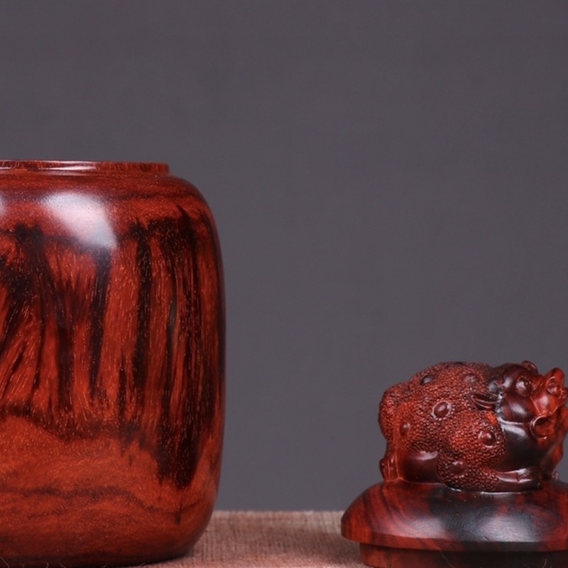 印度小叶紫檀 金蟾 茶叶罐,金蟾必大富,也有吐宝发财财源广进之意,器型简约大气,品质见图,尺寸:9.8/9.8/14.3厘米 重量:1.1斤
