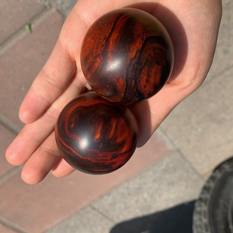 老挝大红酸枝 一对 保健球,同料精打磨而成,器型圆滑均匀,品质见图。自留送人佳品。