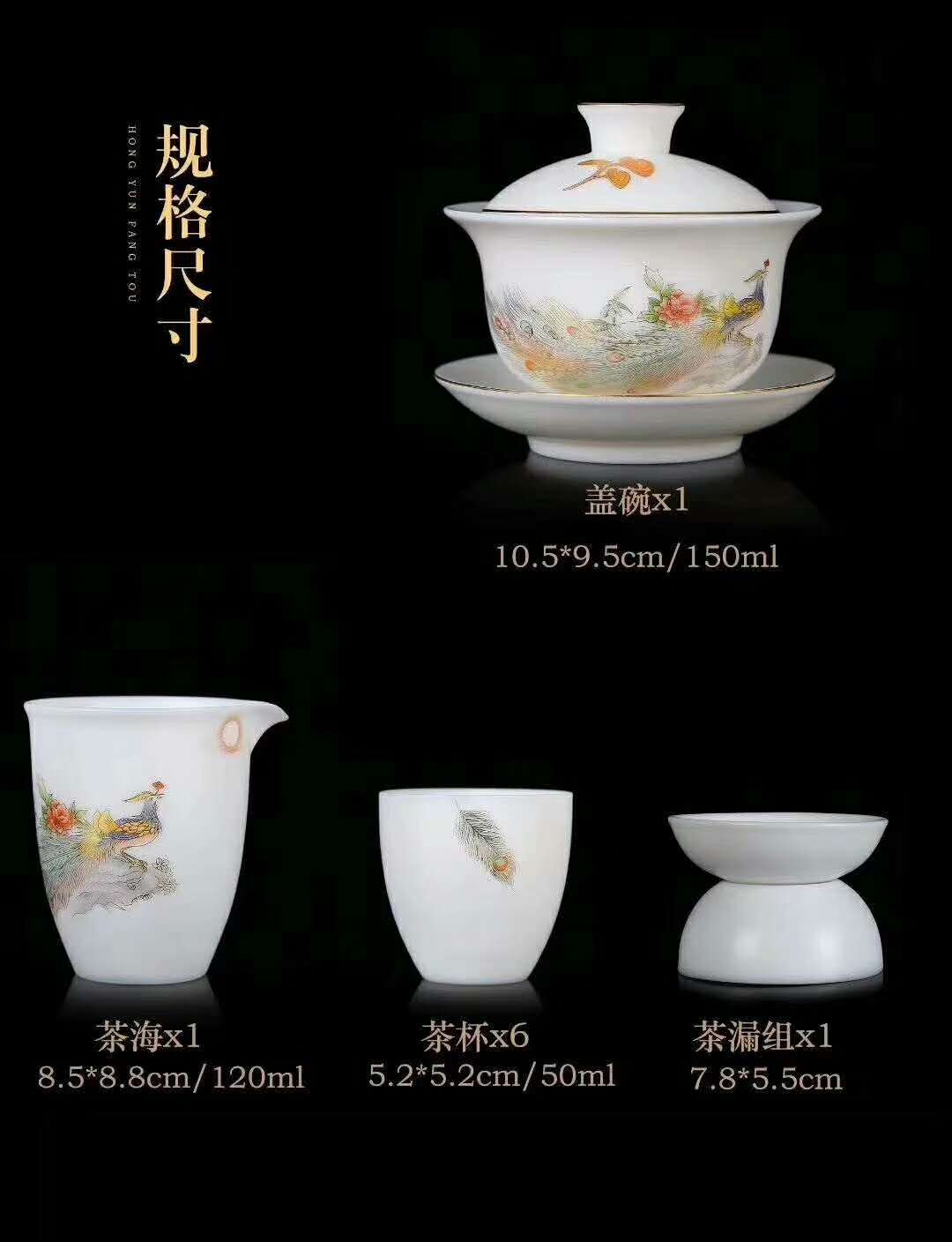 【尺寸与品相】 盖碗*1,10.5*9.5CM/150ml 茶海*1, 8.5*8.8CM/120ml 茶杯*6,5.5*5.2CM/50ml 茶漏组*1,7.8*5.5CM