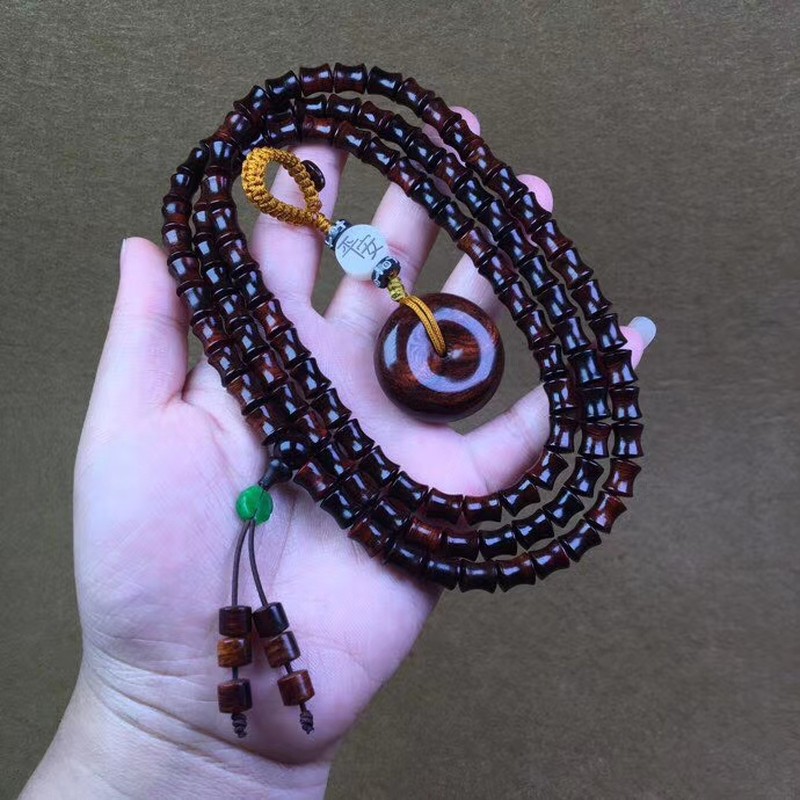 精品海南黄花梨 108竹节手串 竹寓意节节高升,颗颗精选紫油梨高油密,纹理清晰,油性十足,搭配平安扣挂件,完美无暇,精致搭配,盘玩佳品。配送精美礼盒。