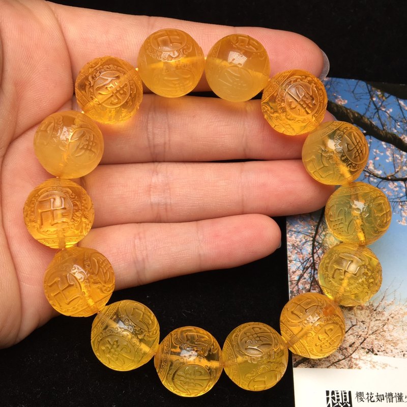 俄料蜜蜡 《六字箴言》手串,蜜糖色,纯天然无优化,无杂裂!直径15毫米,重量29.44克,附带鉴定证书和精美礼盒。
