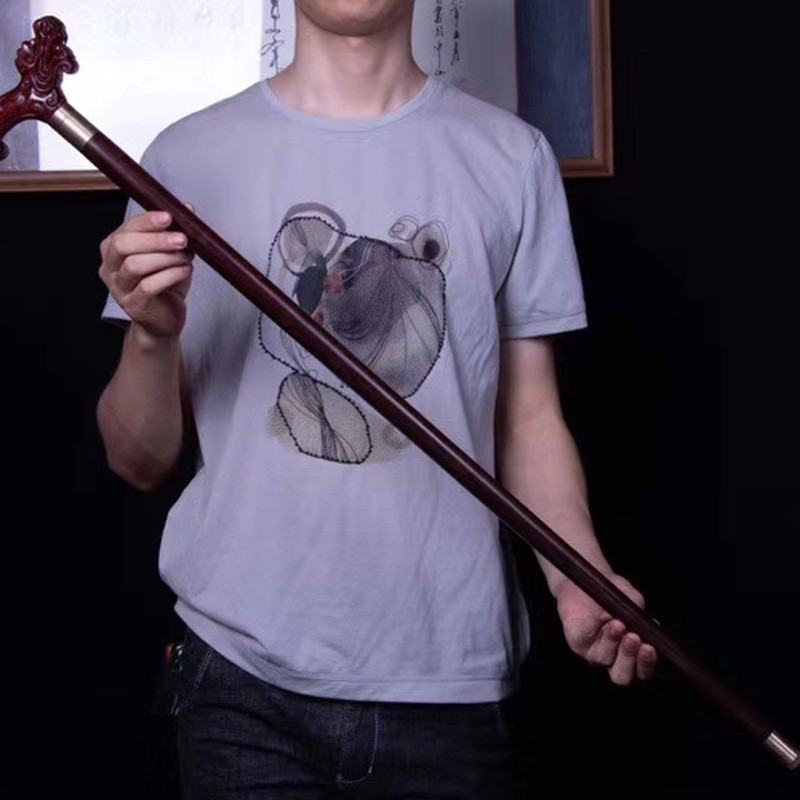 印度小叶紫檀 龙头拐杖,高密度老料,整料立体精雕而成,镶嵌实心纯铜,手感非常好,,长15cm,宽3.3cm,高89.2cm,重1.21斤。