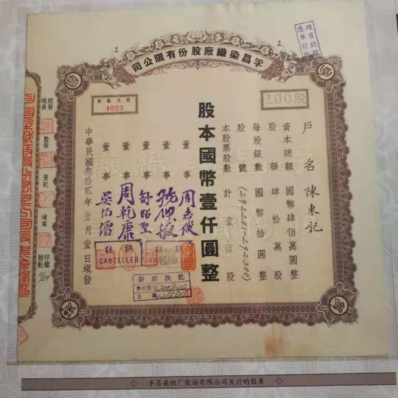 珍藏册里收藏了*时期以及解放初期和改革开放时期的藏品,其中包括12张老股票以及一张*关金纸币和一张华侨银行支票,*老股票上贴有中华*印花税票和备注股民信息,有北京东城区公证书,具有很高收藏价值,请有缘者参拍!(12张股票为孚昌染织厂三张、信和纱厂两张、中国火柴厂、上海永安、茂昌股份、美伦毛纺织染厂、景纶杉袜纺织厂、上海豫园背面标有样票和金杯汽车股份)
