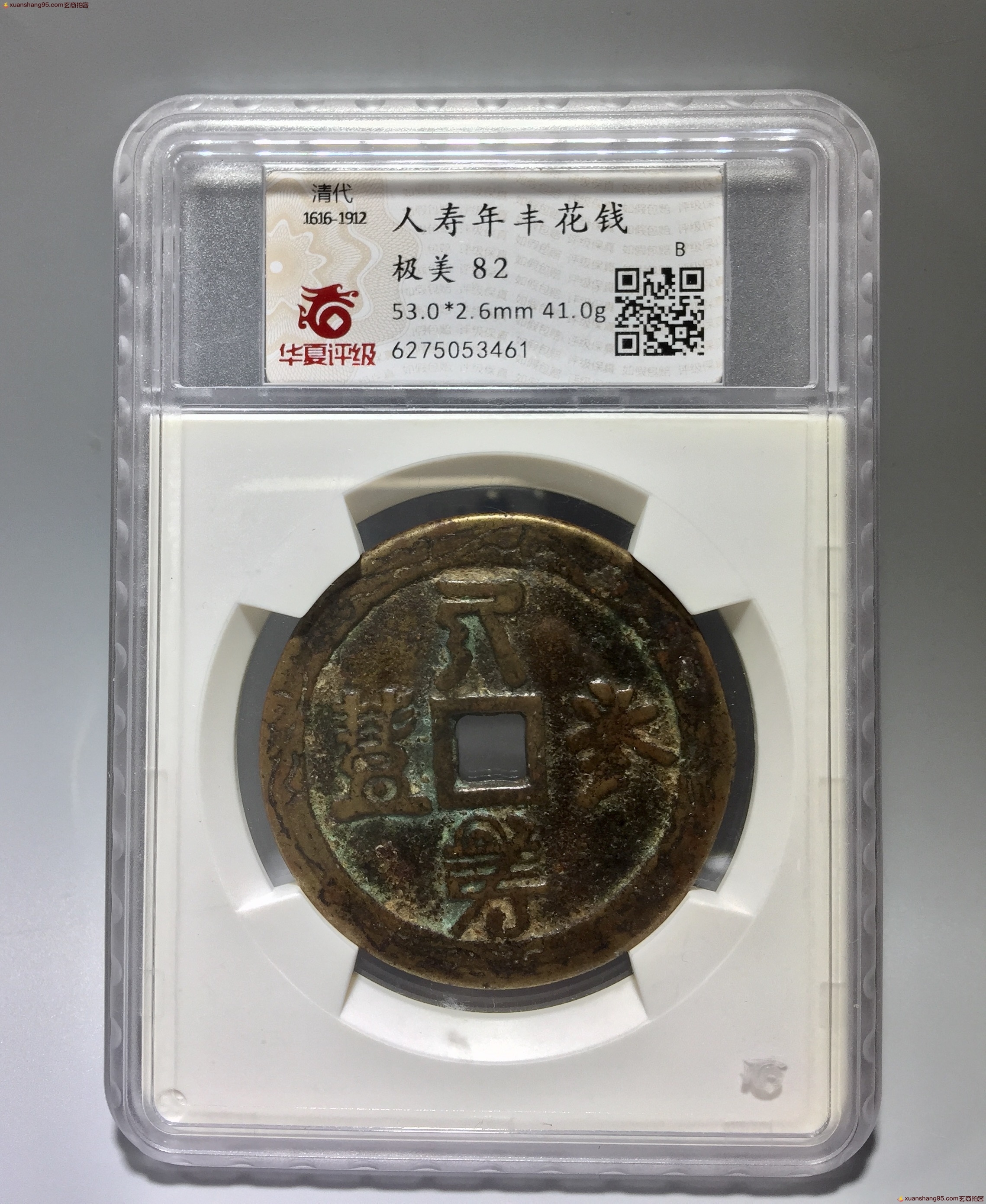 华夏评级极美82分,传世状态,字图清晰,同品种里品相上乘。 贵炉钱,同尺寸有较多品种可成套成系列。此钱人寿年丰与玉堂富贵为对钱,另有荷花、桂枝系列均可归入一类。贵炉钱因题材广博、深邃,加上单品存世无多,在世纪初十分受藏家重视。反而现在受市场品相为王的主导玩法影响变成了价格低洼品种。