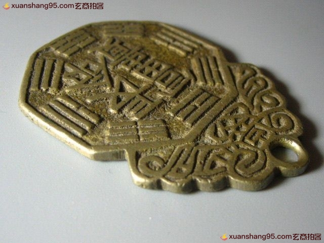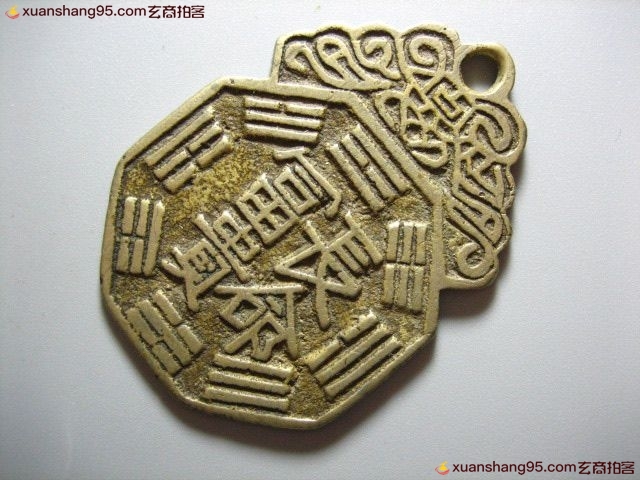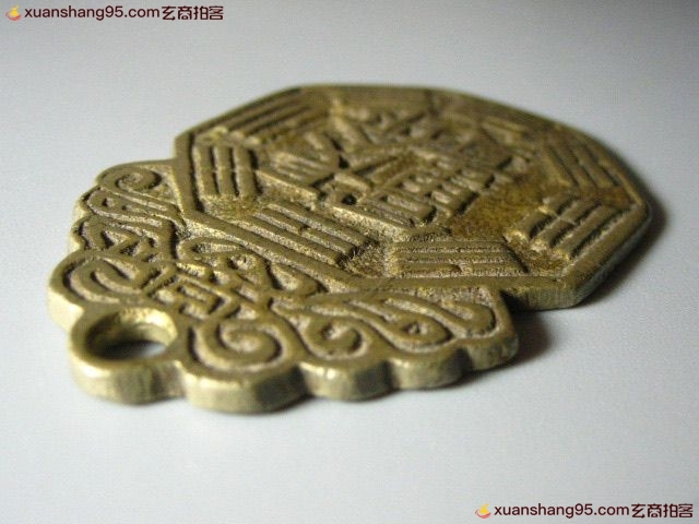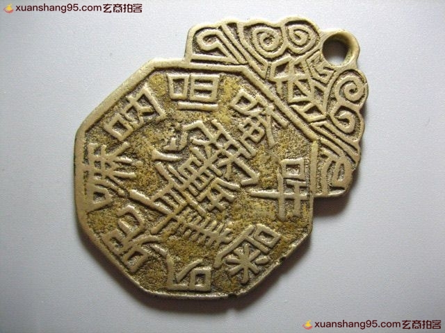 清挂牌 长命富贵背佛语八字真言道教符文挂花,道佛合一的典型代表,八卦围绕"长命富贵”四字,富无点,表示富无尽头。背面是佛教八字真言。底章完美,挂孔有古人佩戴磨损痕迹,头模美品。通高:56,1MM,厚度:2,3~2,4MM