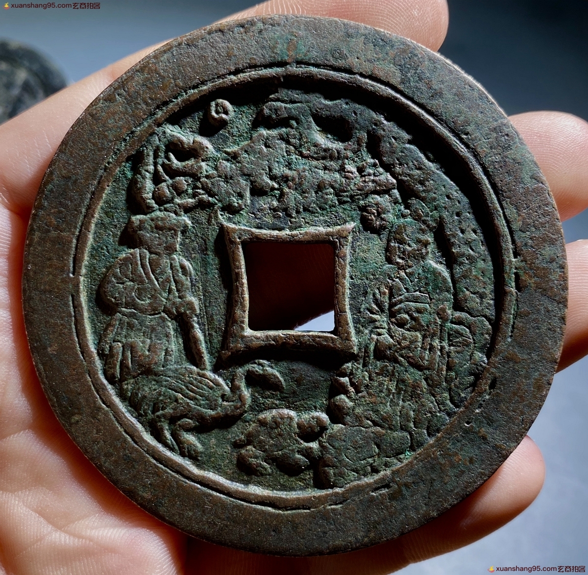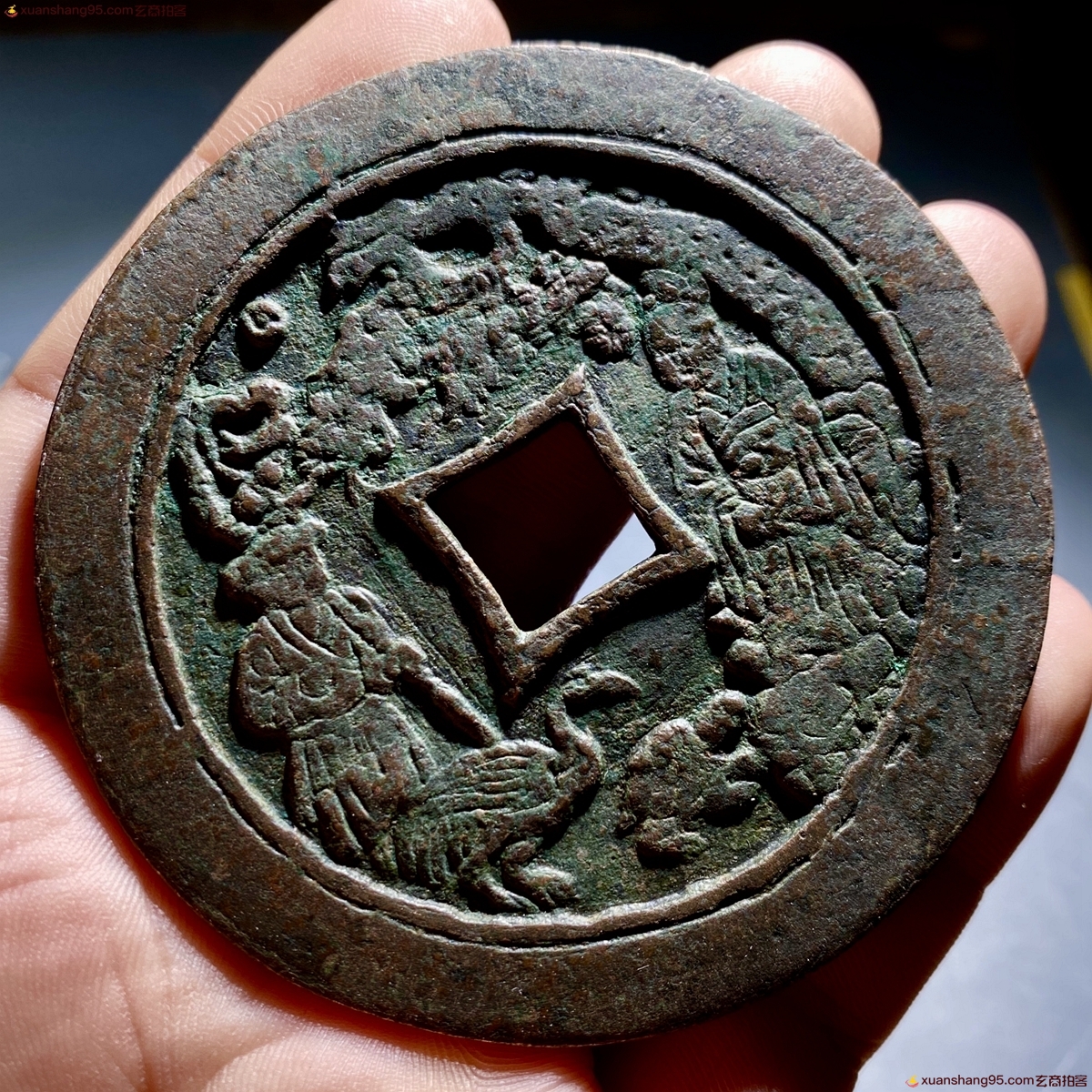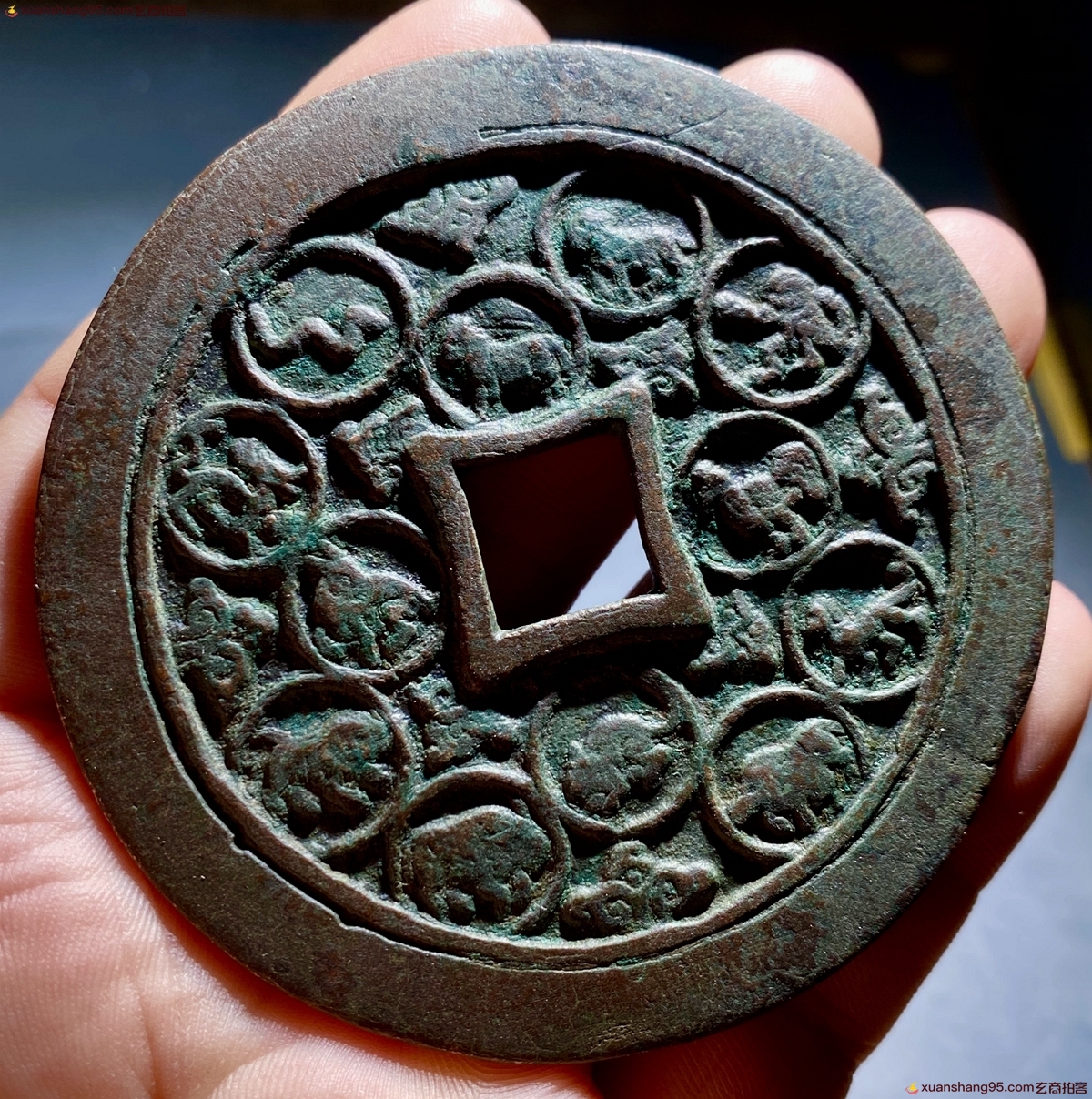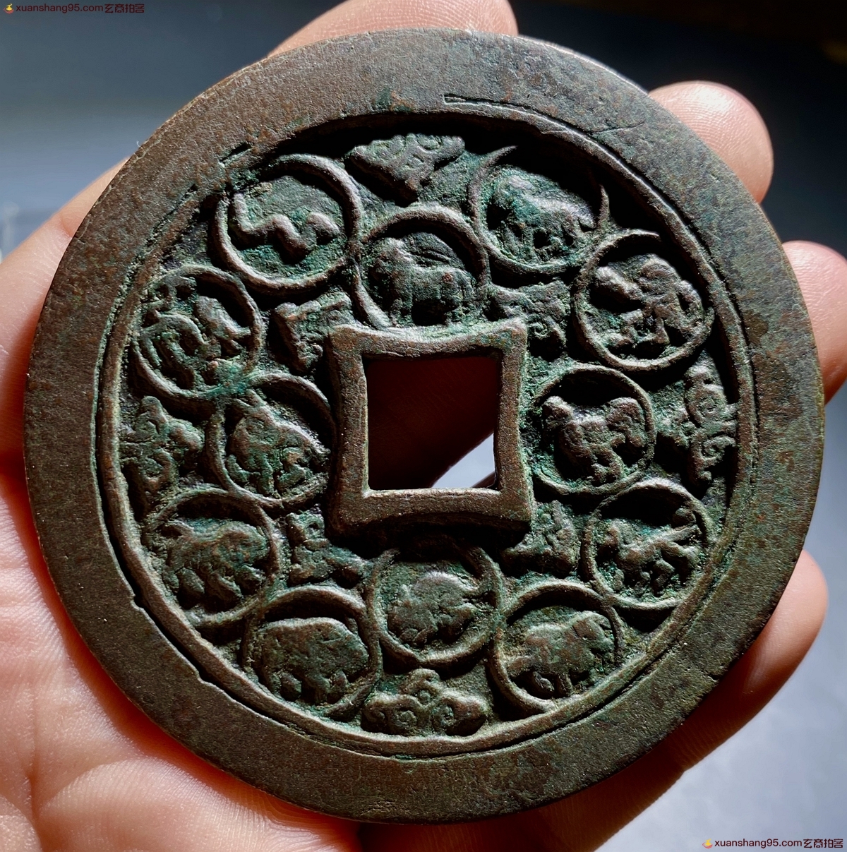 体型硕大,原汁原味,包浆温润,右边松树下有一位老者,面容慈祥,左边明显是一个孩童的装束打扮,作揖状,媳妇纹路清晰流畅,可以推断出当初人们的衣着打扮,而童子脚边的仙鹤和龟,也是栩栩如生,一枚宋代的压胜钱可以反映出当初浓郁的时代气息,年代感十足。而背面为四绝纹十二生肖,每一只生肖都在光环之中,在布局上也颇具匠心,而且在外郭上还有明显的重轮工艺,可见当初匠人为了铸造这枚体型硕大的松下童子背十二生肖压胜钱也是下了不少功夫,能一直流传到,而且没有任何瑕疵毛病,实属不易。此品非常难得,值得收藏;