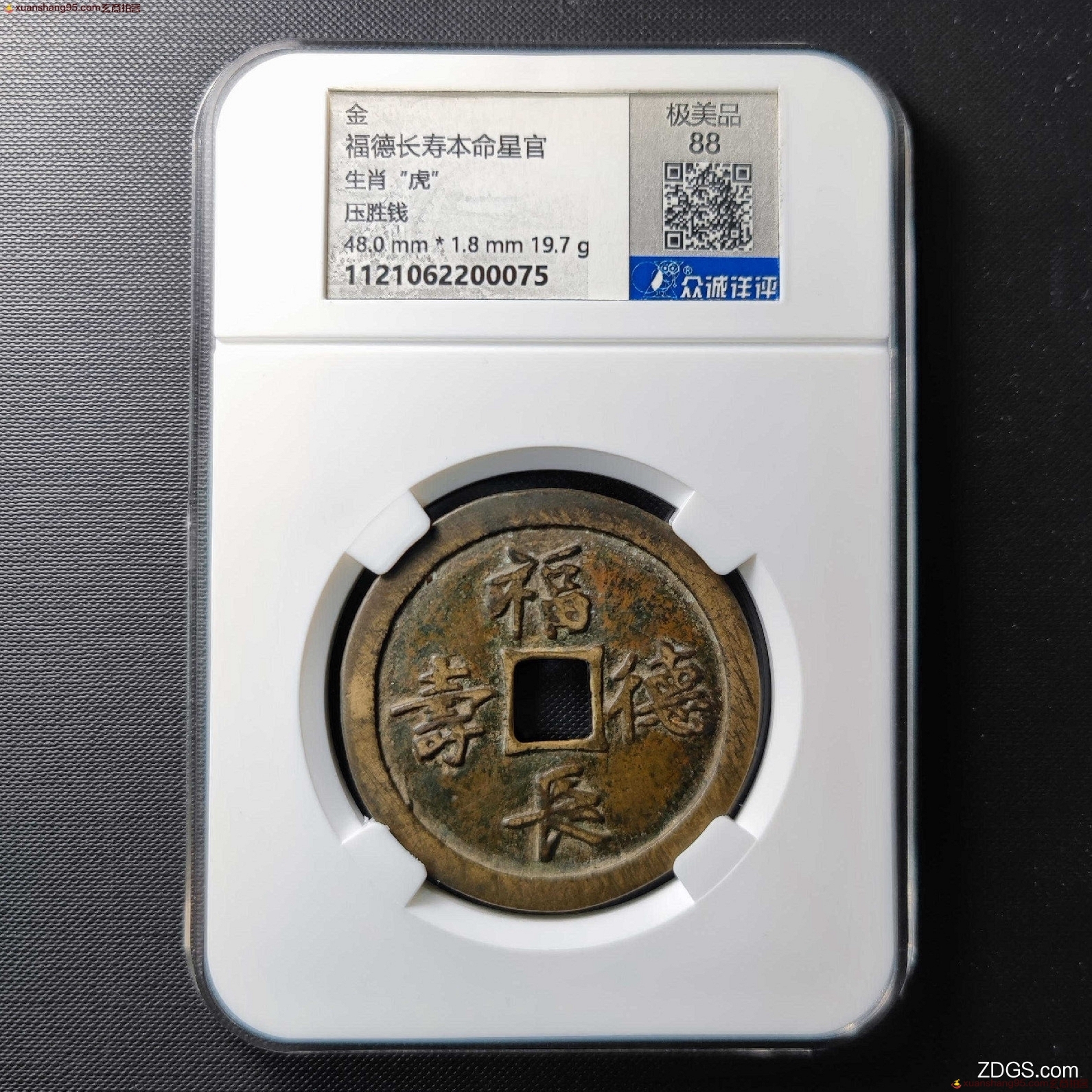 福德长寿背本命星官生肖虎花钱,正面楷书“福德长寿”,背左上“本命星官”四字,右为星官端坐于太师椅上,头戴通天冠,有顶光,身著道服,执笏保佑本命生人。上有星宿,下有生肖图形虎。品相如图,温润如玉,版模极美,少见!本命星官源自道教的星宿崇拜,是指北斗七星的人物化神仙,共有七位神仙, 分别掌管凡世间不同属相的人。《太上玄灵北斗本命延生真经》载:“有回死注生之功,有消灾度厄之力……主持人命,使保天年。”说明本命星官掌管凡人的生死灾厄,是和凡人息息相关的重要神祇。
