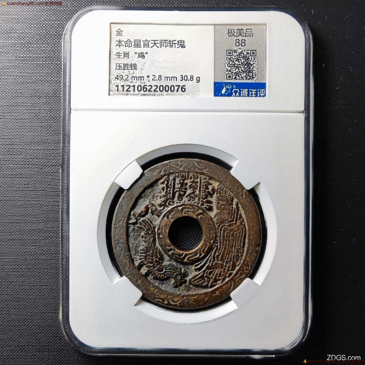 本命星官生肖鸡背天师斩鬼花钱,正面穿上为蔓草纹装饰的牌位,内书为“本命星官”。穿右为星官,头戴通天冠,著道服,双手执笏。意在保佑生肖之人。穿左为本命生肖鸡,面向星官,鸡的神态栩栩如生,如同飞出来的感觉。空中有符籙飘下,寓意辟邪祈福。钱背穿上有星座,穿右为道教符籙。穿右张天师挥舞大刀,穿下小鬼仓皇逃窜。该钱实物精美,刻画细腻,精铸漂亮,收藏级品相!