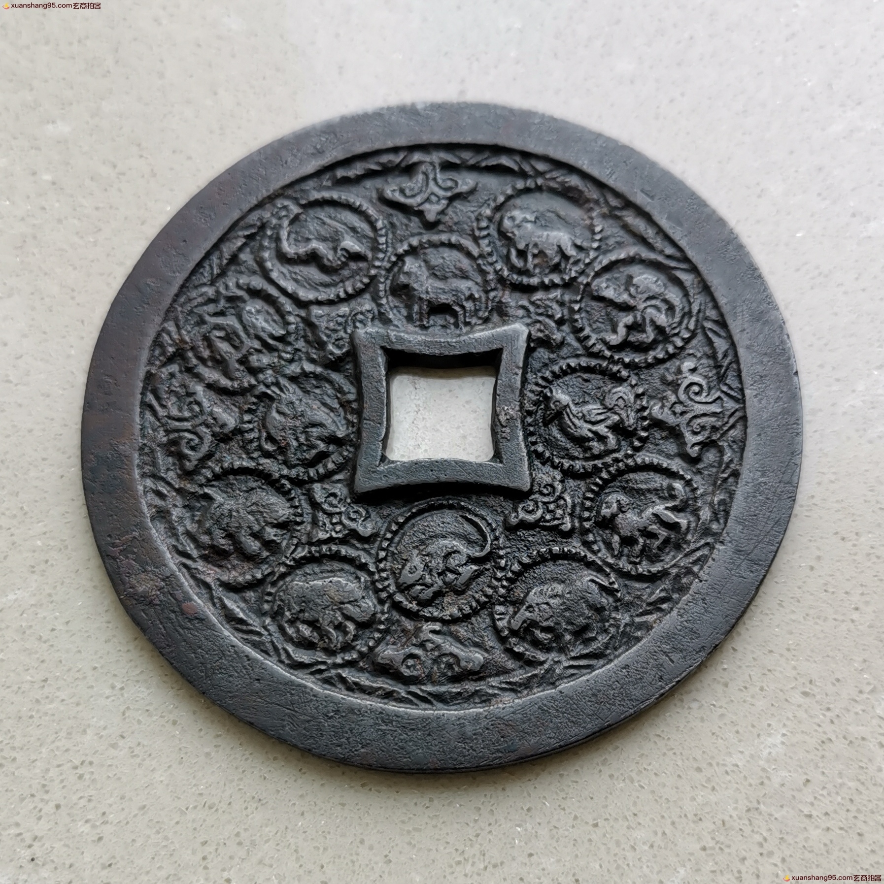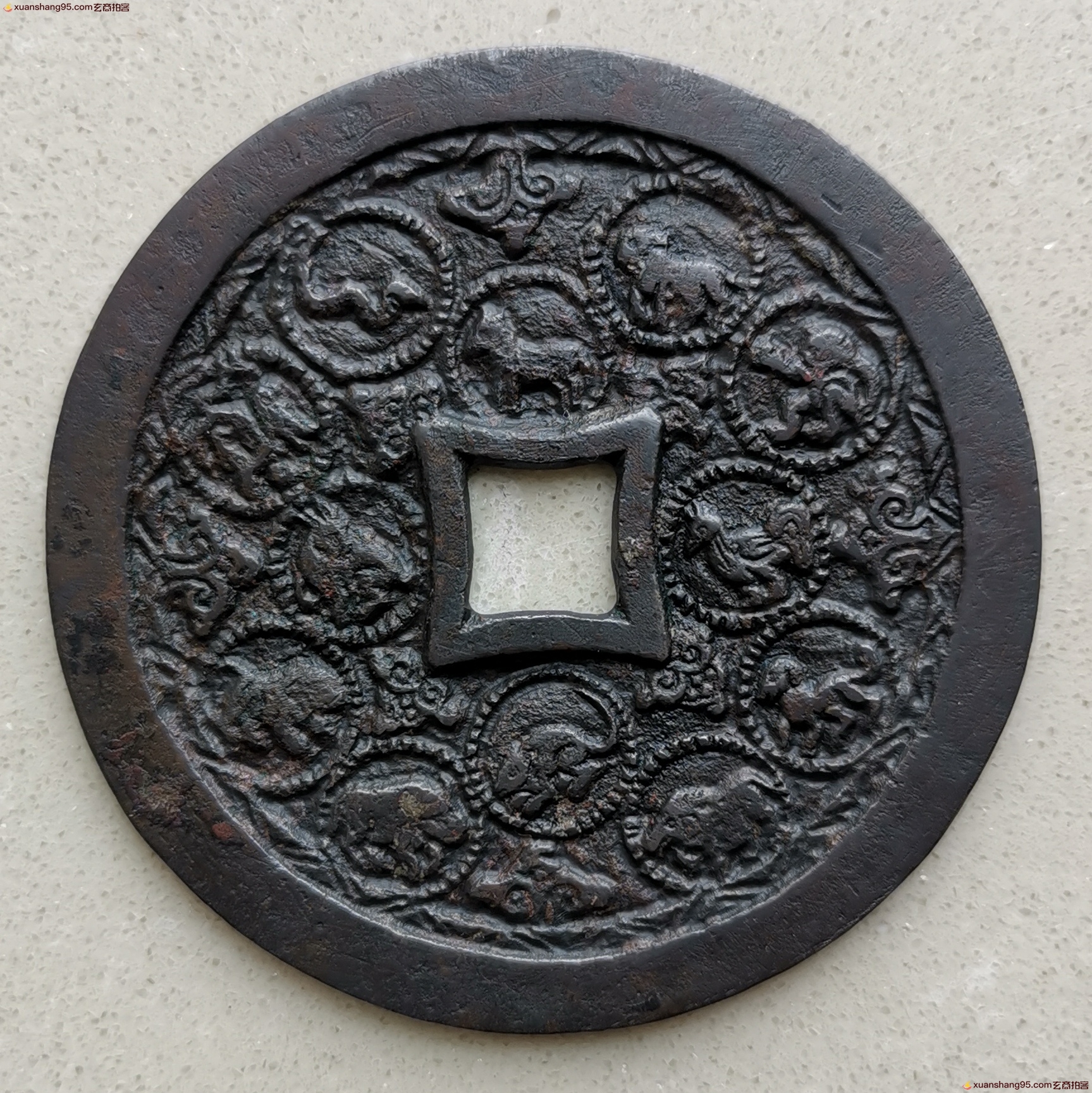 此钱为连珠圈生肖版中的头模,线条刻画精细,细节刻画清晰,直边状态。此钱俗称“松下童子”,实际是寿星题材,穿右松树下手持拂尘的道教人物是寿星,穿左持龙头拐杖挂葫芦的是侍女,穿下是龟鹤,背十二生肖。寿星源于道教的星宿崇拜,《史记•天官书》载:“西宫狼比地有颗大星,叫“南极老人”。老人星出现,治安,老人星不见,兵起。”