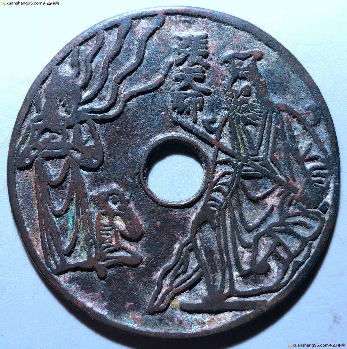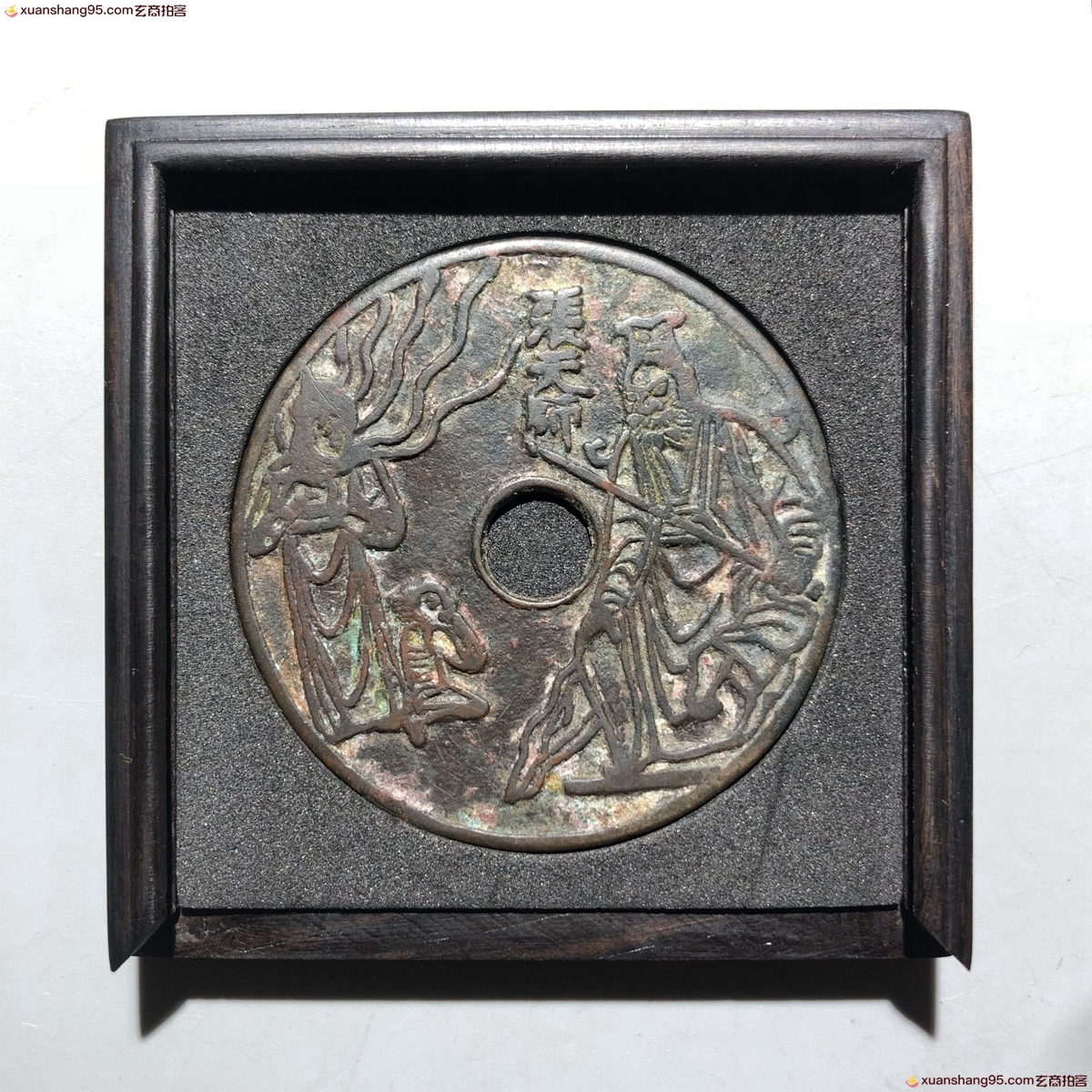 张天师驱鬼花钱版式繁多,按小鬼数量来分类,可分为一鬼版、两鬼版、三鬼版。其中一鬼版稀少罕见。此拍品为一鬼版,钱币正面穿上楷书“张天师”,“张天师”三字无牌位,穿右为张天师端坐于太师椅上,左持斩鬼宝剑,穿左有一小鬼跪地降服,小鬼身后站立侍童,手持符印放射光芒,背面为十二生肖,穿外饰卷草纹,平整无缺陷,人物线条纤细、栩栩如生,品相完美;