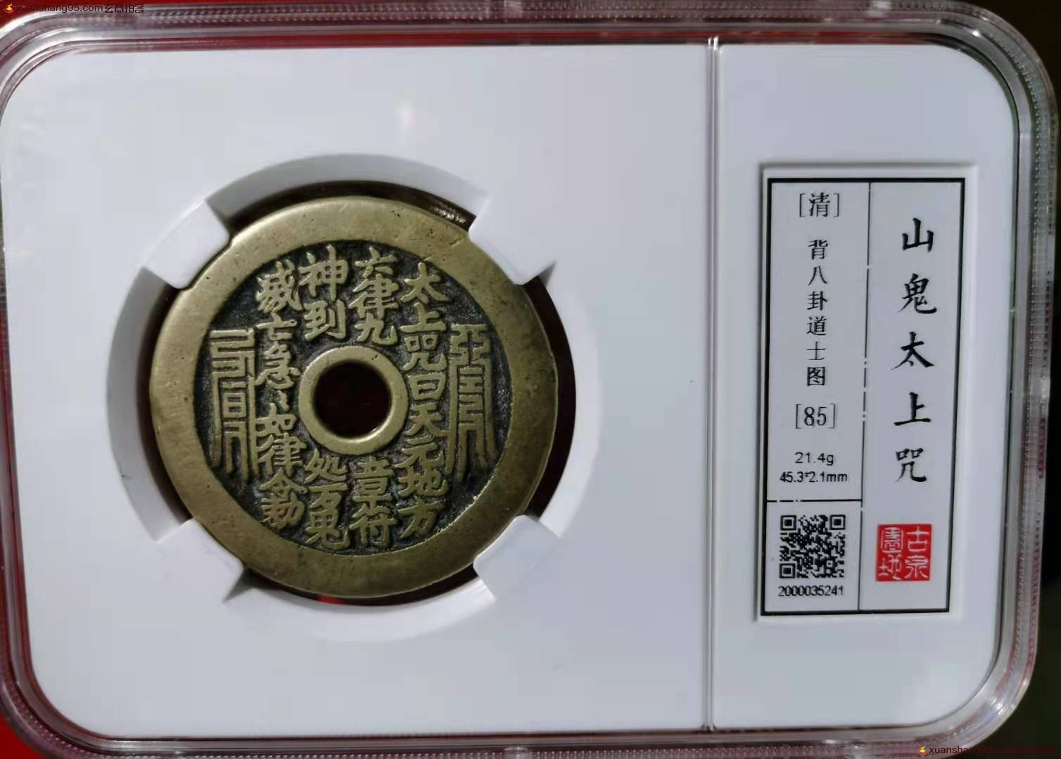 山鬼太上咒背八卦道士图花钱,园地严评85,铜,45.3*2.1mm,21.4g; 经典花钱,热门题材,包浆温润熟美,字口图案清晰。自古以来,山鬼都是以正义、高大的形象存在,以山鬼纹饰、铭文的各种器物也多被人们赋予护佑和辟邪的作用,其中的山鬼花钱,以其小巧轻便、易于佩戴的特点,成为人们最喜闻乐见的一种配饰,作用就是祈求辟邪保平安。推荐收藏。