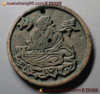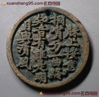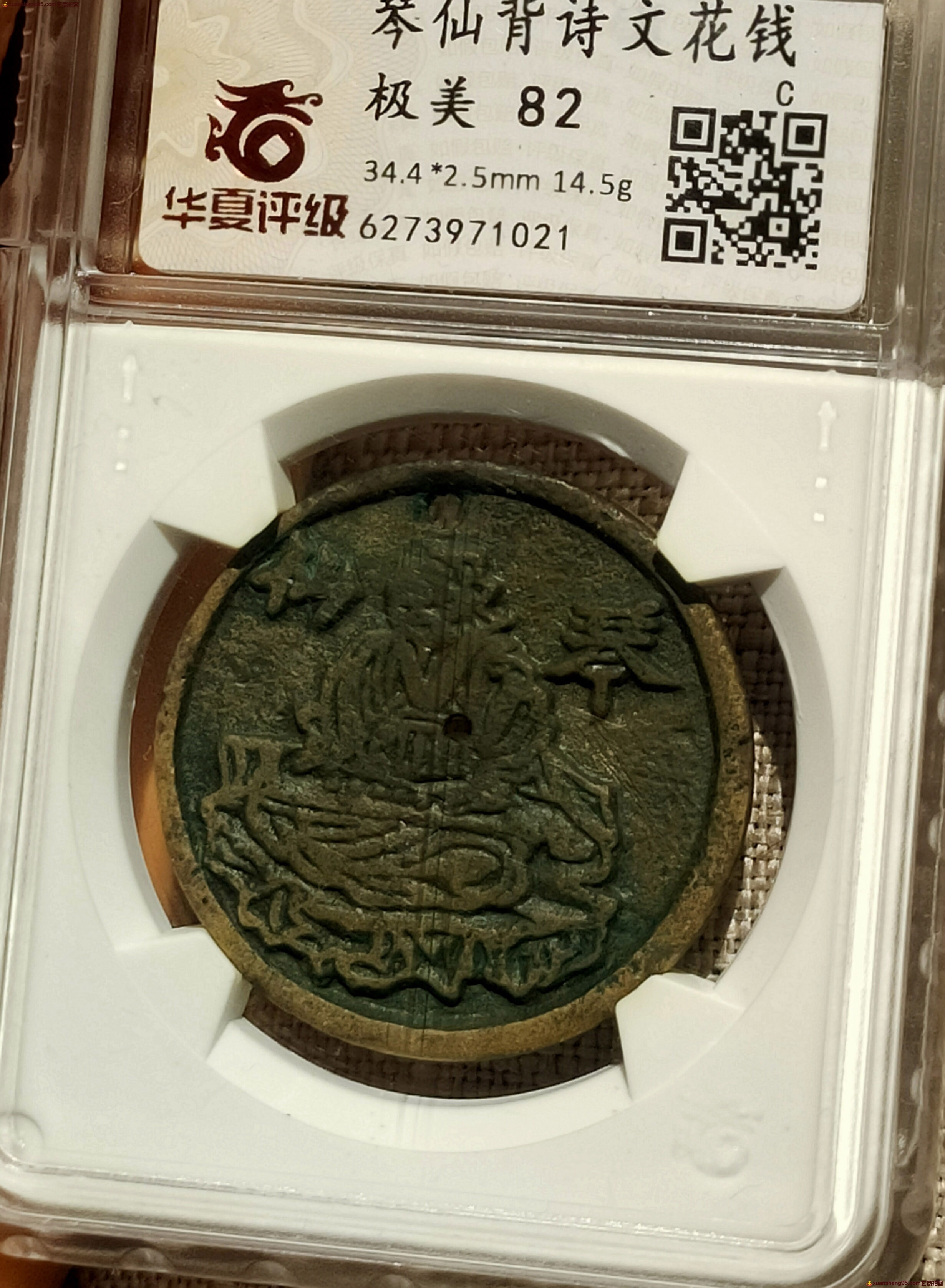 “琴仙”花钱一枚,又名“琴仙钱”,正面刻俞伯牙抚琴图,背面刻“膝上按焦桐,宵分一曲终,知音有谁是,明月与清风”诗文,是一枚古人借以传颂伯牙与子期“高山流水遇知音”佳话的花钱,寄情高雅,制作精美。诗文文字高耸,保存完好,有两处老打孔,不影响文字、图案,极美品,华夏评级82分。