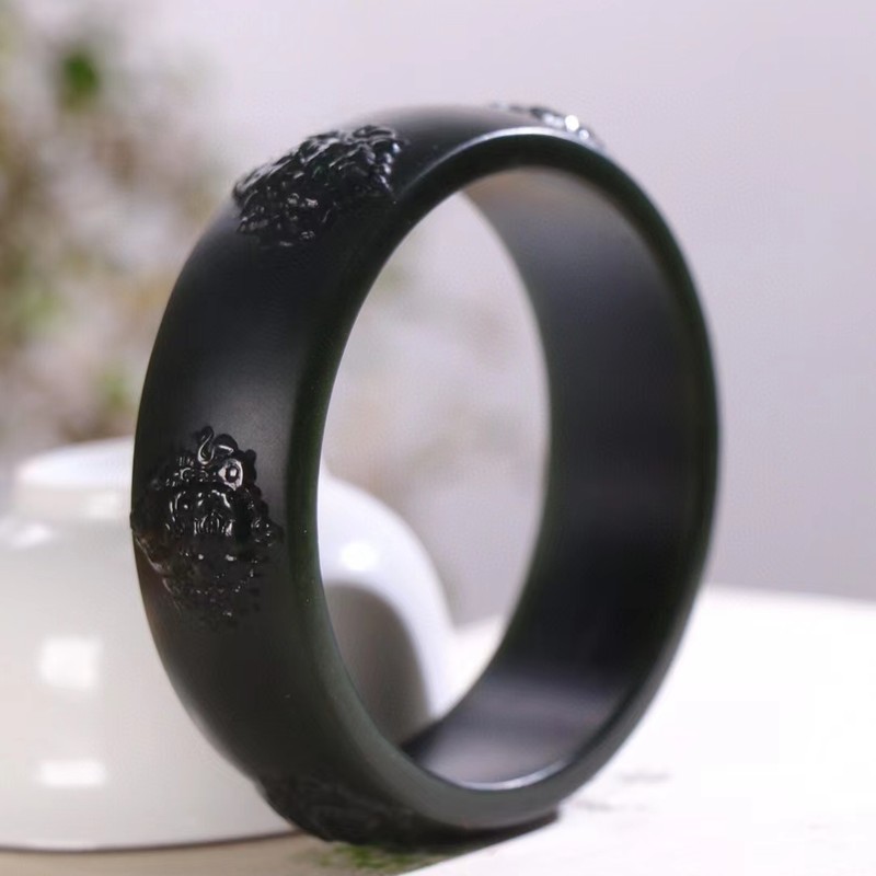 和田玉 青玉【守护】手镯,精选和田玉青玉细料,玉质油润细腻,镯身精雕仿古兽面,兽角弯曲,双眉如火,怒目圆瞪,威严肃穆,给人宁列威慑之感,兽音同寿,长寿延年之意,亦可驱魔保平安,长寿吉祥。人讲佩玉为美,黄*有*玉无*。玉埋藏地下几千年货是上亿年,玉中含有大量矿物*素,玉中的矿物*素会慢慢让人体吸收。所谓“人养玉三年,玉养人一生”,*医书称“玉乃石之美者,味甘性平无毒”,并称玉是人体蓄养*气最充沛的物质。配送和田玉鉴定证书,支持复检 。 内径:57mm 尺寸:20-10mm 重量:68g
