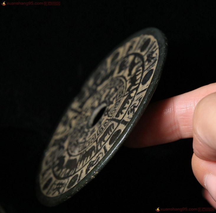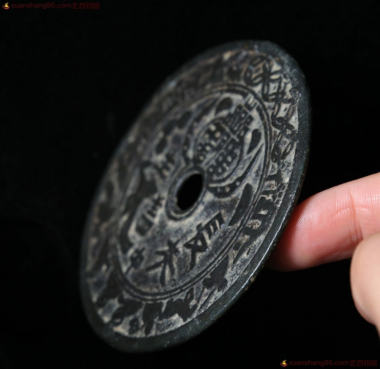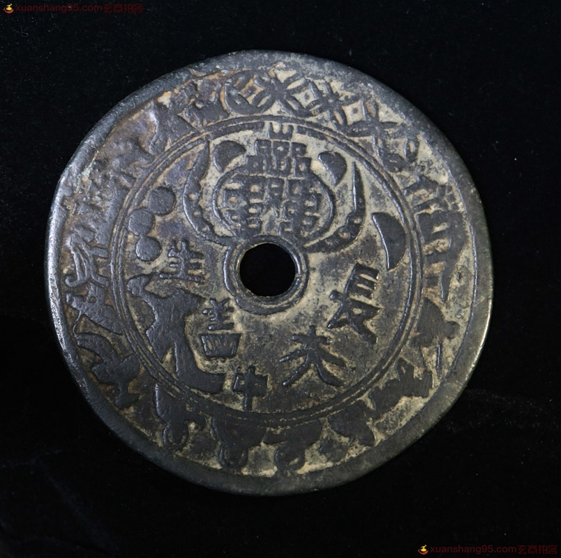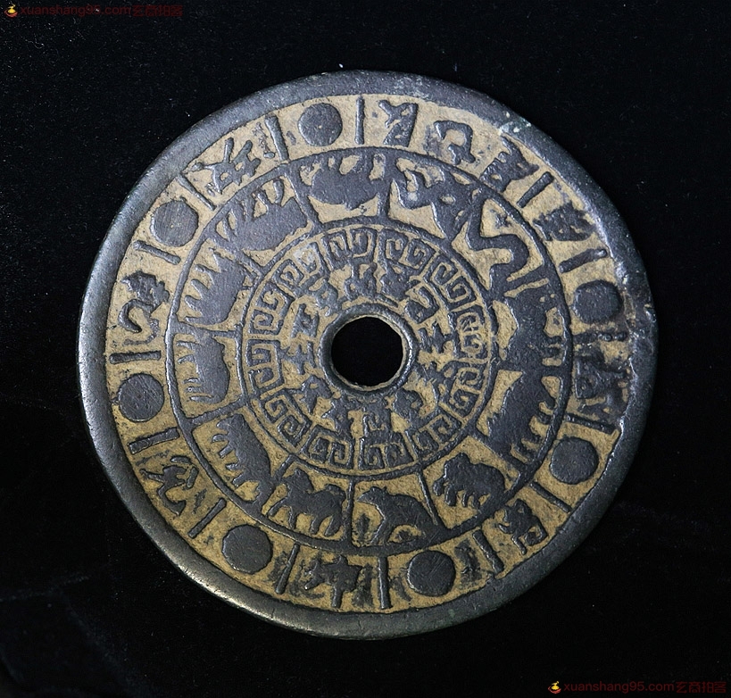 民俗钱币大藏家吾道鼠曾经在钱币的专业论坛对该品类花钱有过精辟的描述:长生赤盖中背十二生肖地支八卦精品花钱,硕大直径79.3mm厚2.6mm,云贵炉精品花钱,《中国花钱图集》里评为四级,‘珍稀少见’。钱文绝美华丽,正面上方文字图案应为尚未完全破译的水书文字也可能是佛教、道教符文,周围长生赤盖中,严格说应该暂定长生X盖中,因为是否为‘赤’字,花钱专家意见尚未统一。正面外圈是神鸟、连环的古泉以及神秘难解的吉祥图案,寓意富贵吉祥、长命百岁,详细解读细节下面有一张图,三佛位于上方,这枚钱中有佛教元素的加入,是道佛结合类的民俗花钱。背面穿口外侧是地支以及水书特有的【回字纹】,再外侧是十二生肖,最外圈是七星八卦星点纹,七星为北斗七星,被巧妙分布在八卦文中间相隔,又加七星文表明北斗。如此华美而且不能完全透解的精美花钱具有重要的历史、文化内涵。