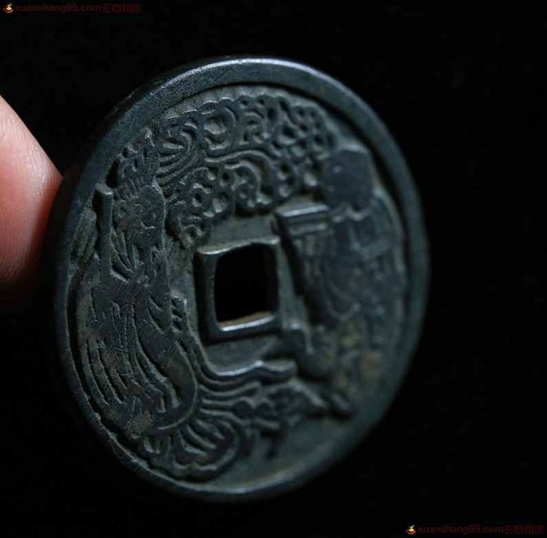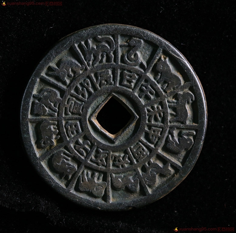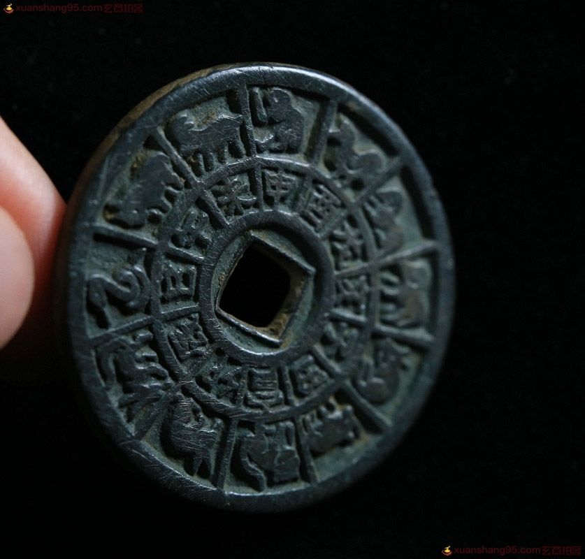 图录号041 龟鹤仙人花钱 质地:铜 质量:19g 尺寸:38x38x2.6mm 此版别神仙人物,特别少见,品相和声音皆佳,具有头模藏品的一些特征!包浆温润,龟鹤和云彩刻画传神,人物服装线条清晰自然,背面12生肖字口深邃清晰,动物表情传神。此钱币为传世收藏品,值得拥有!