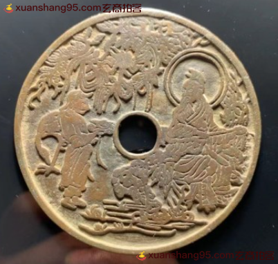 少见版寿星背生肖大钱,此版稀少,特征是寿星头顶光环是双圈,而同时期花钱上寿星光环通常都是单圈,极为独特。此钱头版头模,人物面部细节和衣物褶皱纤毫毕现,完美体现了神怪花钱高度写实的艺术风格,品相亦绝佳,几乎达到零磕碰状态,通体棕色包浆,沉着温润,可上手把玩。钱体较薄,钱形硕大,神怪花钱的基本特征,堪称神怪钱工艺的标准器,收藏投资两相宜的精品。