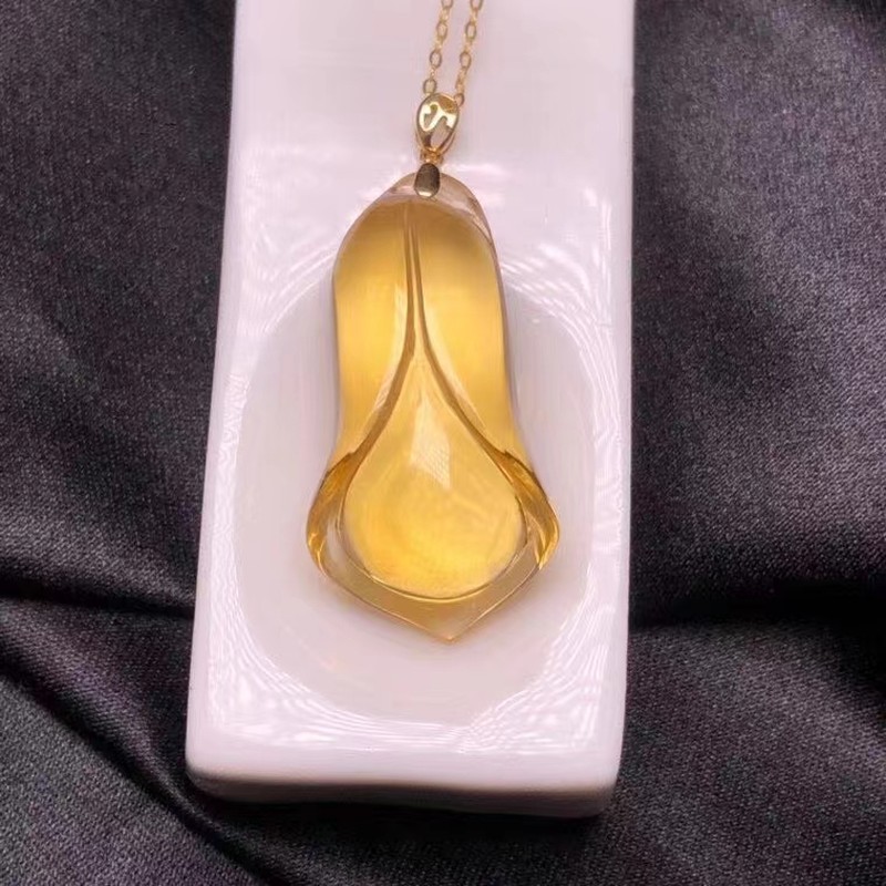 精选 纯天然 巴西 黄水晶 吊坠 纯手工打磨,晶体通透,水头足,佩戴佳品。尺寸32*16*10毫米 天然发晶中发丝多为平直丝状,细小者也有呈弯曲状的,常呈束状、放射状或无规则取向分布。发丝细直、且呈平行取向的发晶,加工后可出现猫眼效应,成为发晶中的精品。发晶有红、绿、黑之颜色分别,而以针状和发状包体在晶体中排列疏密有致、璀璨华丽者,无需加工即为最佳观赏宝石,属于珍品,外国收藏家送它一个“维纳斯发石”的美称。