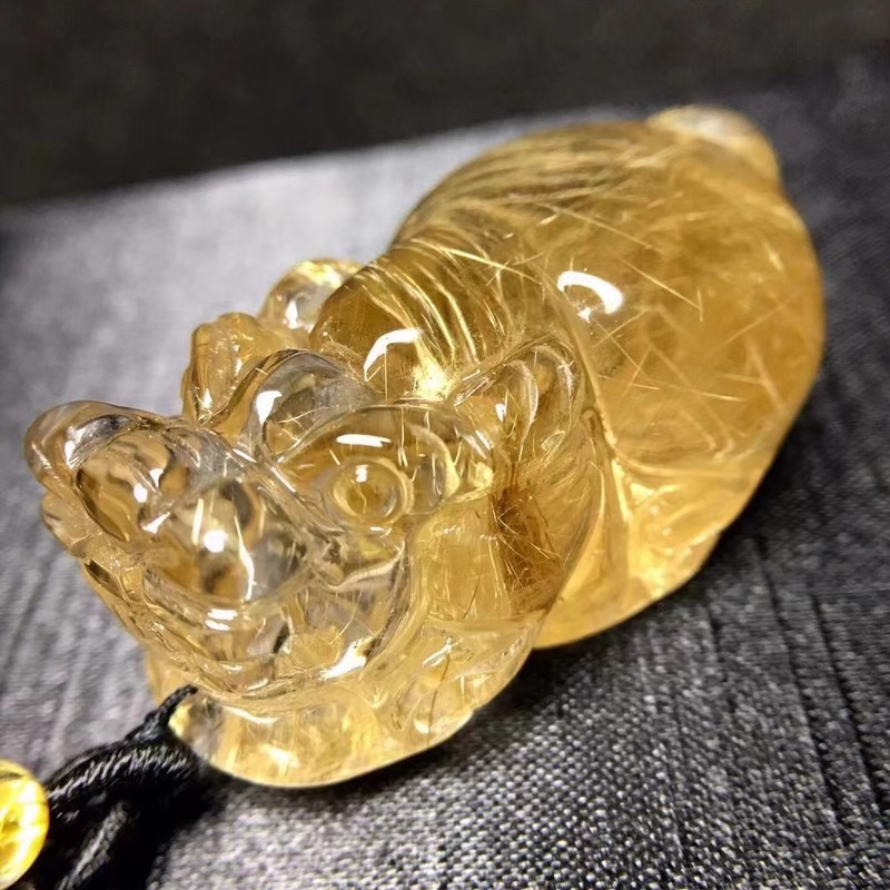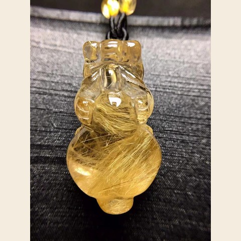 纯天然 黄水晶 发晶 招财貔貅 雕工精细 颜色是黄金色,造型简单大方,金光闪闪,佩戴佳品。尺寸42*25*19毫米 重量36克。天然发晶中发丝多为平直丝状,细小者也有呈弯曲状的,常呈束状、放射状或无规则取向分布。发丝细直、且呈平行取向的发晶,加工后可出现猫眼效应,成为发晶中的精品。发晶有红、绿、黑之颜色分别,而以针状和发状包体在晶体中排列疏密有致、璀璨华丽者,无需加工即为最佳观赏宝石,属于珍品,外国收藏家送它一个“维纳斯发石”的美称。