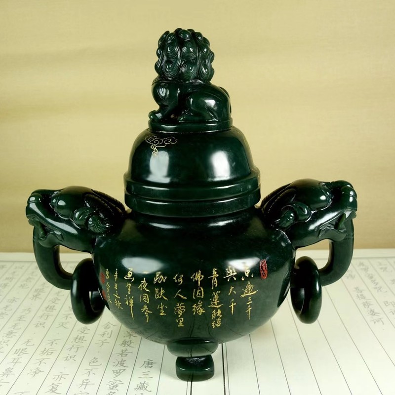 甄选 和田玉 青玉 事事如意 三足熏炉 玉质细腻 精工雕刻 简约大气 尺寸181*177*108毫米 重量918克。和田玉,“中国四大名玉”之一(其三为陕西蓝田玉、辽宁岫玉和河南独山玉)。传统狭义范畴特指新疆和田地区出产的玉石,以和田“子料”为代表闻名于世;广义的和田玉指软玉(真玉)。和田玉虽然因新疆和田而命名,但其本身不是地域概念,并非特指新疆和田地区出产的玉,而是一类产品的名称。中国把透闪石成份占98%以上的石头都命名为和田玉,都在国标范围内。 秦始皇统一中国的时候,和田玉因产于昆仑山被称为“昆山之玉”,以后又因位于“于阗国”境内而被称为“于阗玉”。直到清光绪九年(1883年)设立和田直隶州时,才被正式命名为“和田玉”。