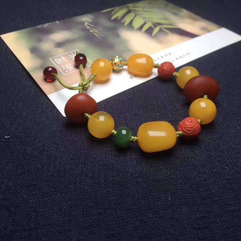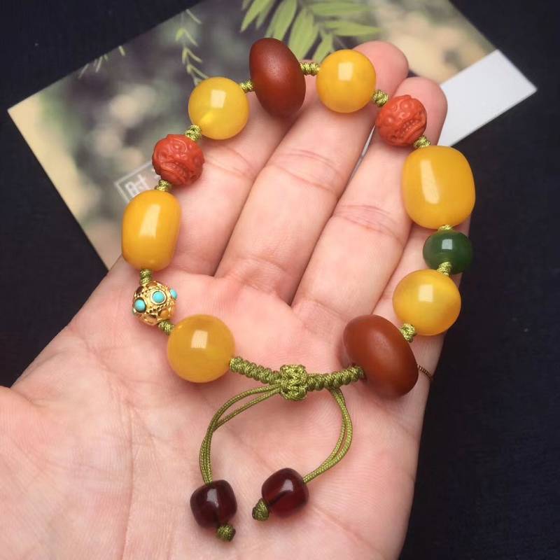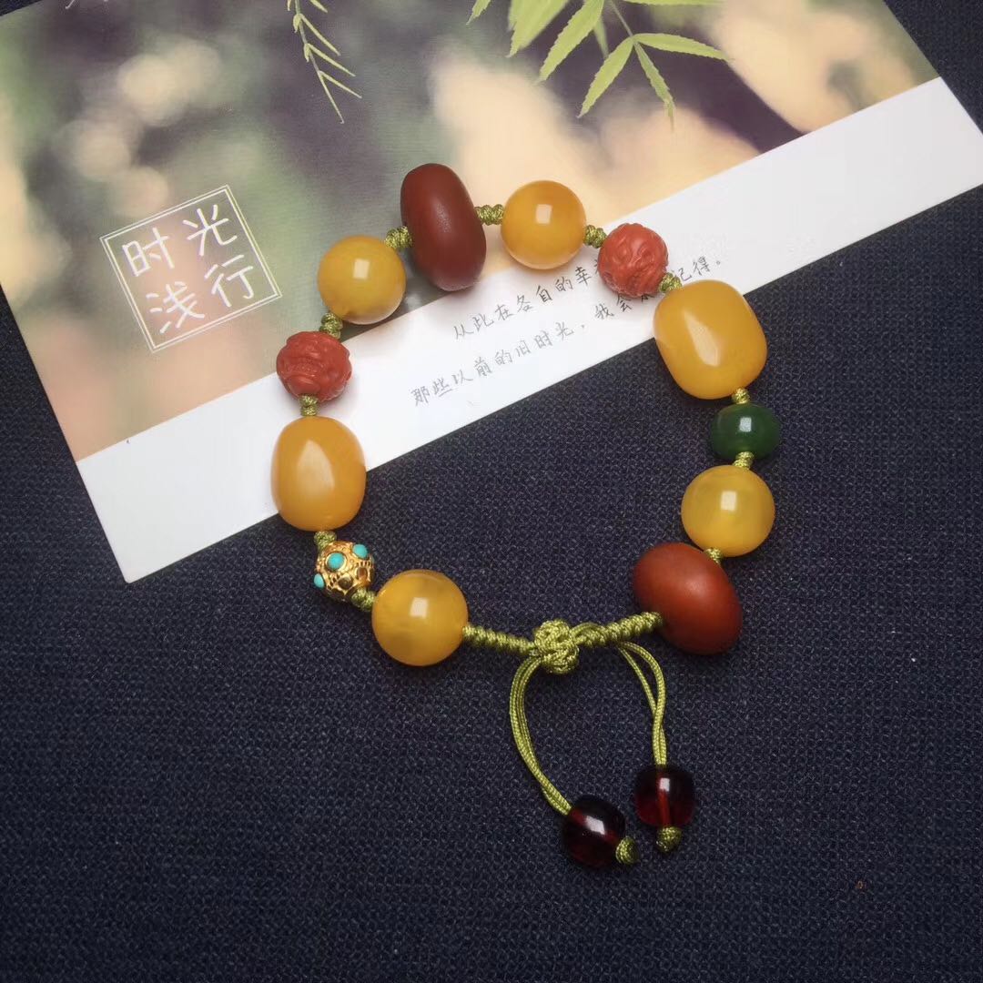 精致的天然蜜蜡多宝手串 搭配橘紅色老蜡扣、老蜜圆珠12mm、老蜜随形珠、南红雕刻瑞兽珠、血珀老型珠、碧玉鼓珠、綠松镶嵌银珠,好运连连的多宝手串,顺丰包邮。