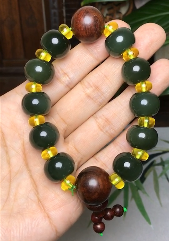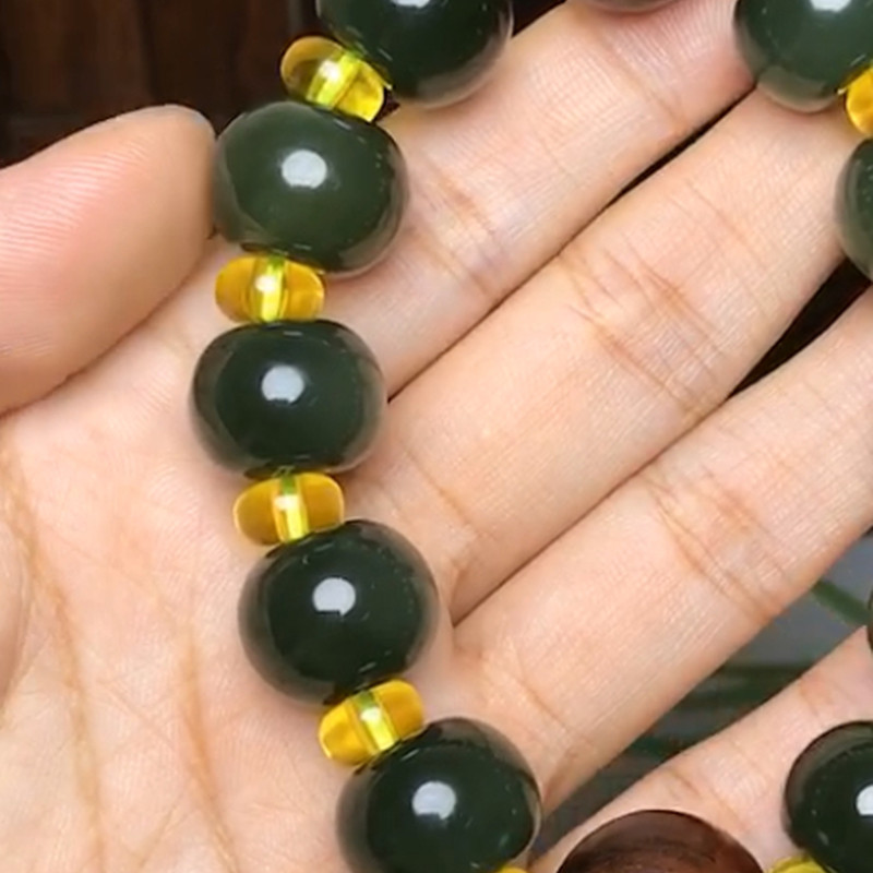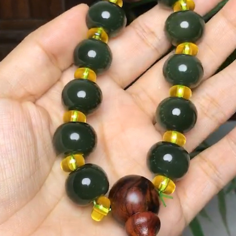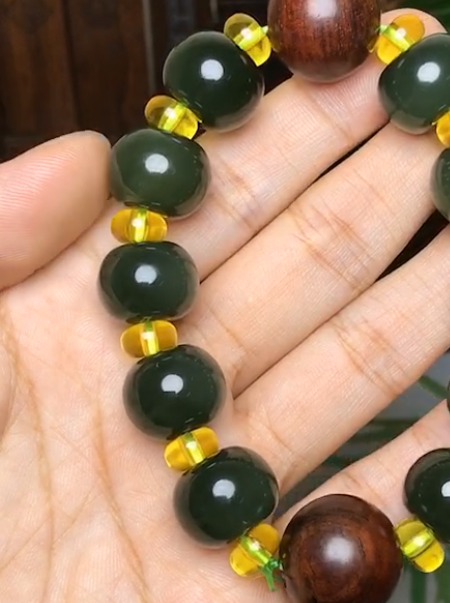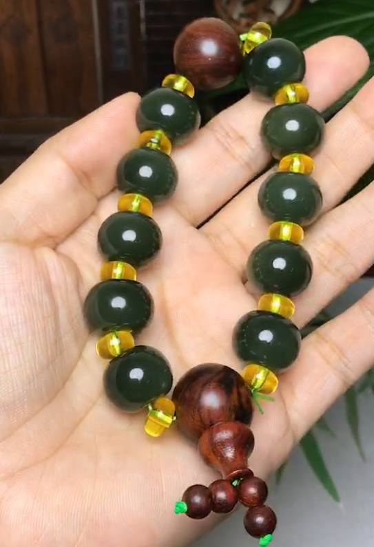 精选 和田玉 青玉手串 湖水绿手串 玉质细腻 油润 做工精细圆滑。重58.5克 尺寸15-12mm。