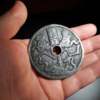 图录号003 五男二女玄武背婴戏图花钱 质地:铜 质量:40.0g 尺寸:62.5x62.5x2mm 五男二女背婴戏 少见大直径,传世状态,无破裂补。五男二女早期花钱品种里比较经典的版式,尺寸硕大。此钱原味状态,并没有做加刀处理。 拍品详情 包浆自然老辣,风格特征明显、品相如图所示,值得收藏;