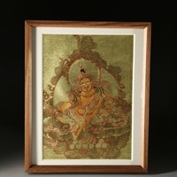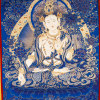 尺寸:75*50cm 拍品简介:白度母是二十一度母中最受尊敬,也是最为常见的一位,白度母全称为“圣救度佛母”,据说是由观世音菩萨右眼眼泪所化。此尊白度母肌肤洁白温润,衣着发饰华丽,双腿结跏坐于莲座之上,面相柔美端庄,安详温和。除面部两眼之外,额心及两手心、两足心都各生一眼,共七只法眼,表示慧眼遍布。此幅唐卡,通体湛蓝,宁静深邃,金丝勾勒,雍容大气。