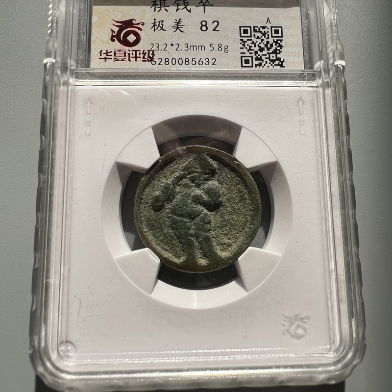 图录号046 棋钱卒花钱 质地:铜 质量:5.8g 尺寸:23.2x23.2x2.3mm 少见版棋钱卒 ,传世品相,包浆熟美,磨损自然,开放盒82分 品相完好 边道直边 ,值得收藏,整套收藏的藏友不要错过哦;