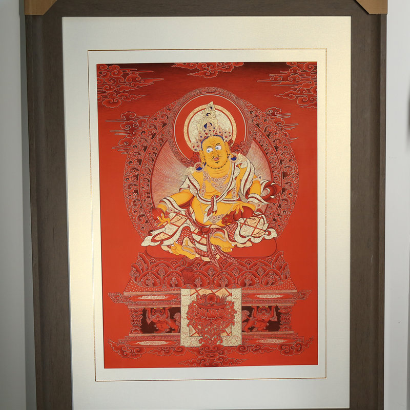 尺寸:70*50 拍品简介: 这幅红唐黄财神,是喇嘛绘制,背面有章,这个唐卡是收藏级别的,很少会流传到社会上,基本上只会在寺院和画院里流通,这幅因为机缘,到我们玄商的拍卖行里上拍,喜欢可以结缘。 此幅唐卡恢弘大气,如此画幅巨大而绘制细致的唐卡并不多见,颜色晕染到位,财神开脸称得上是同品类画作的上上乘,此尊黄财神衣着华丽尽显贵气,衣裳细腻的金丝纹路经得起任何比例放大的考验。 黄财神为藏地各大教派奉持的五色财神之首,上身袒露,下身着裙,右手持摩尼宝,象征宝光普照十方,增添众生的福报;左手抱一只大猫鼬,鼬的嘴里含着珠宝,象征财宝。右脚踏一只白色海螺,象征着他能入海取宝。绘以气势难挡的大红色,实乃股民投资之不二之选。