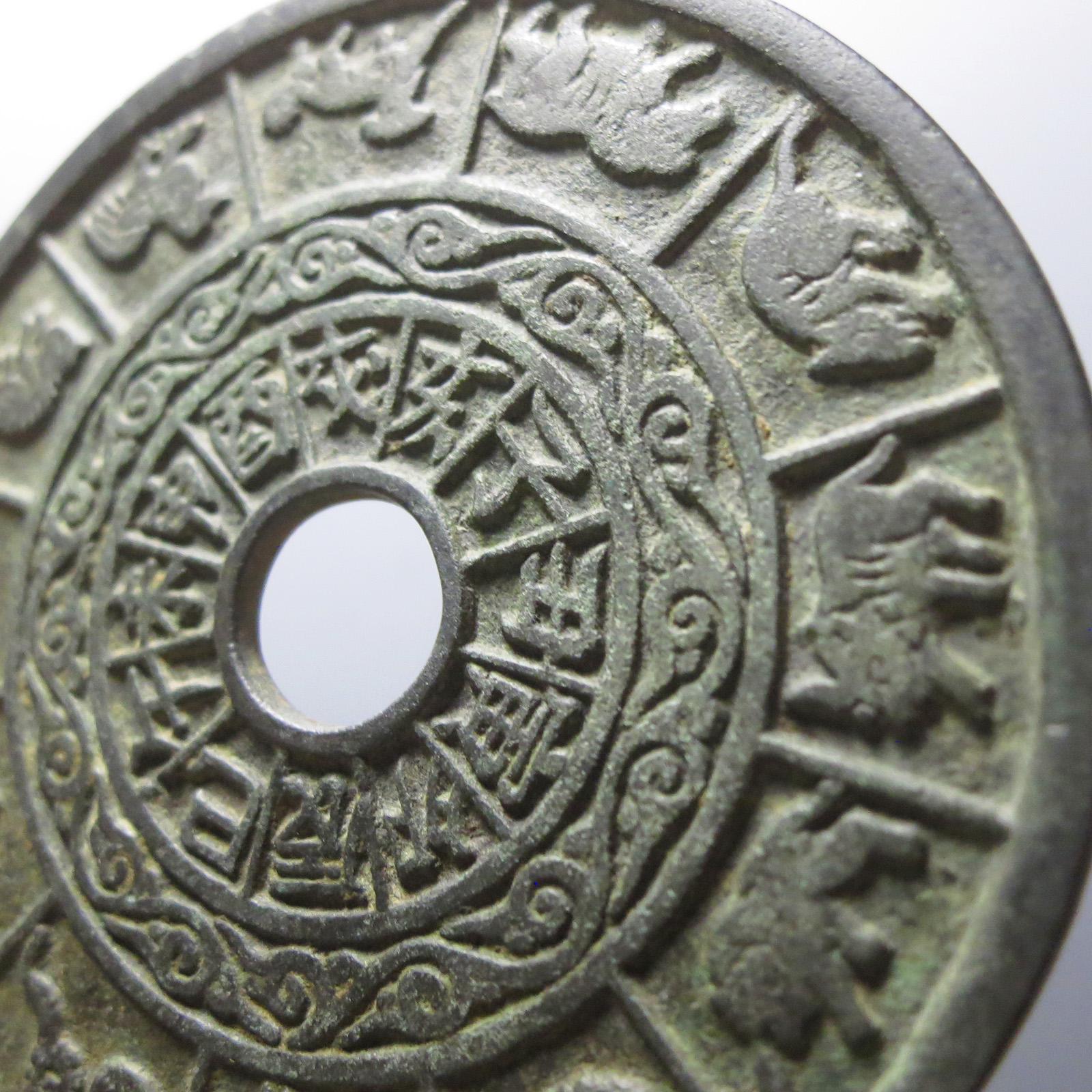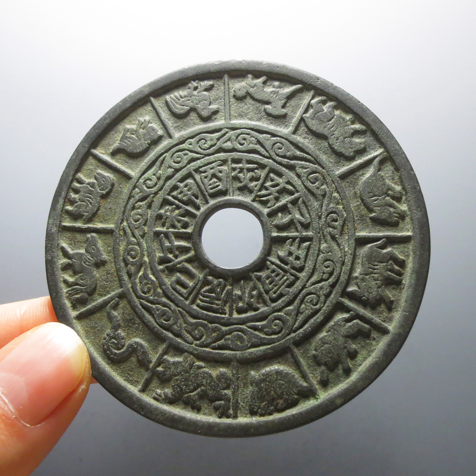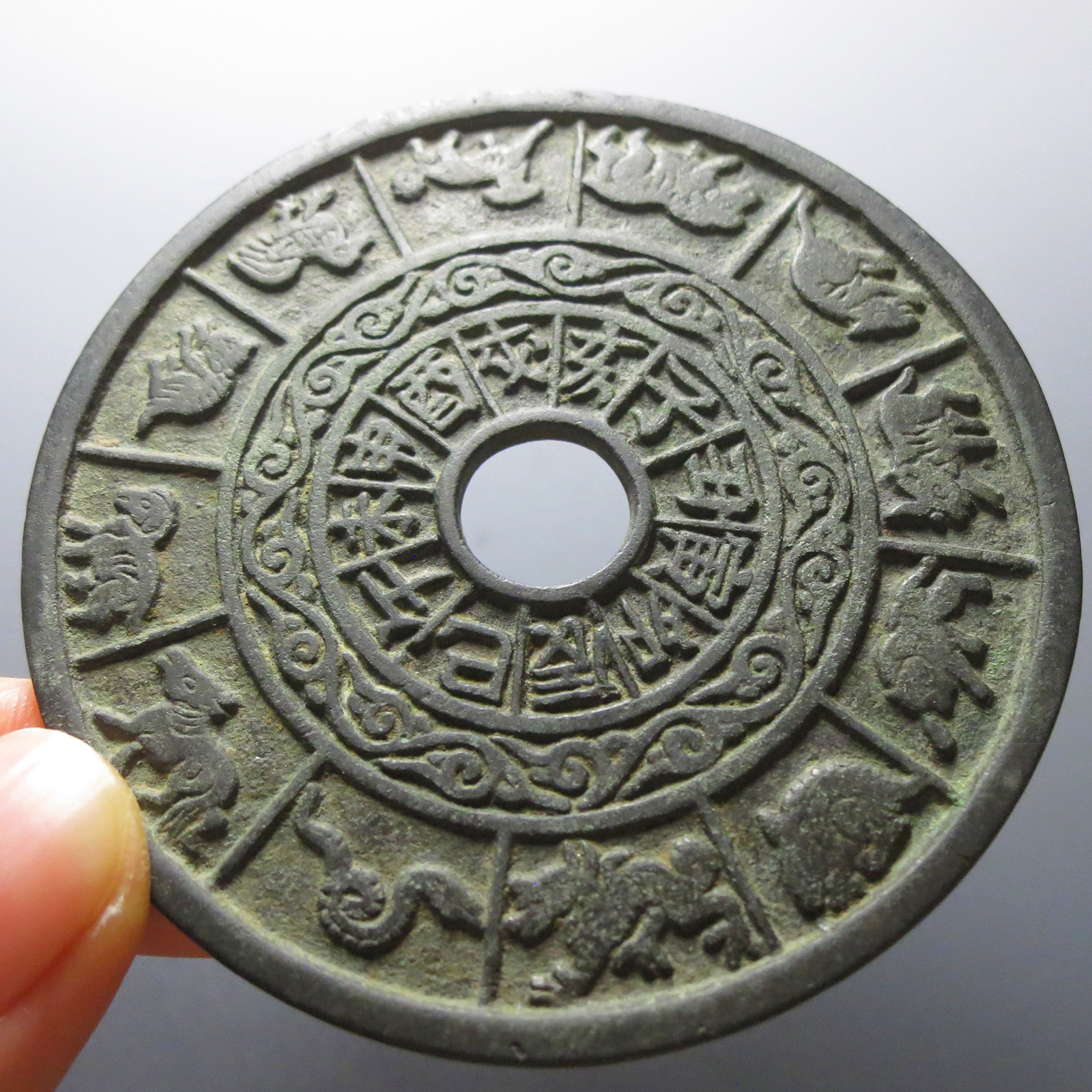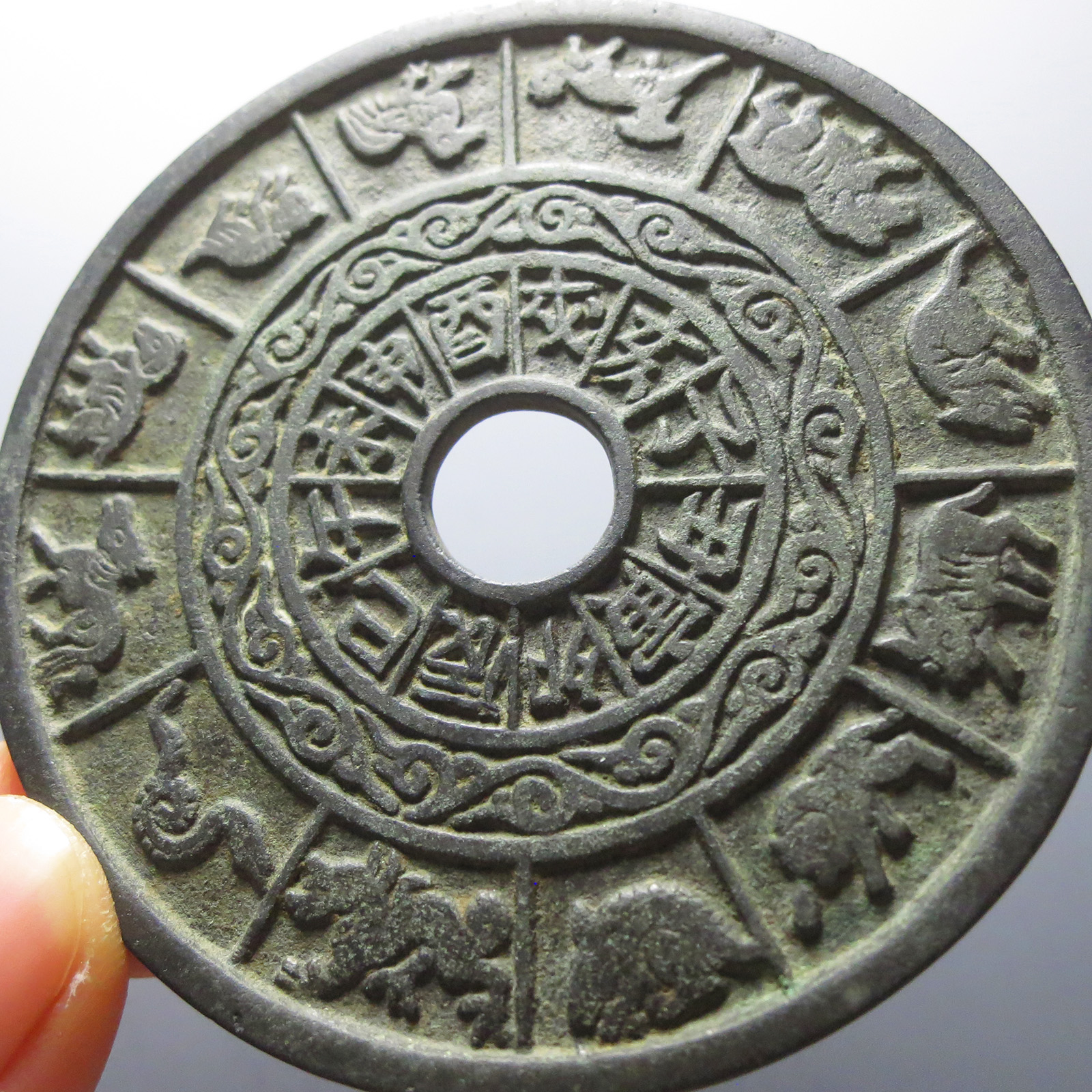 老子讲经背十二生肖花钱,此钱传世品相,包浆漆古老辣,熟美自然,头版头模,藏者所见最大直径,藏品保持非常完好!藏者所见最美!画面整体布局,十分饱满,线条清晰流畅,一面人物故事,穿右松下老者,老者面部、衣皱细节入微,穿左童子躬身面向老者,穿下仙鹤,姿态悠然祥和,细节入微,俨然一副精彩绝伦的铜版画,画面极具视听性,引人入境!一面生肖地支,间穿缠枝纹布局,十分考究,极具代表性,一步到位的藏品,潜力大,推荐收藏!!!!