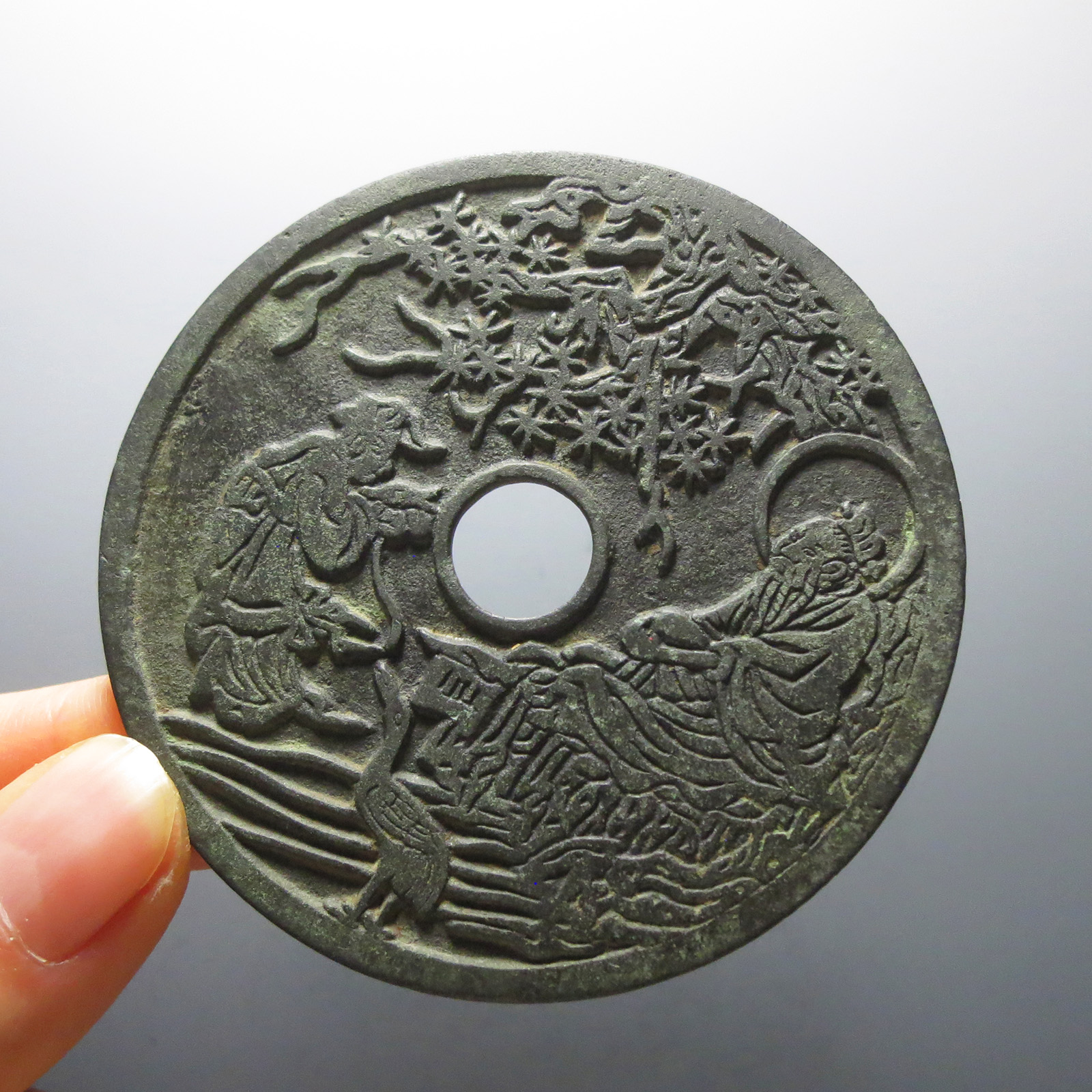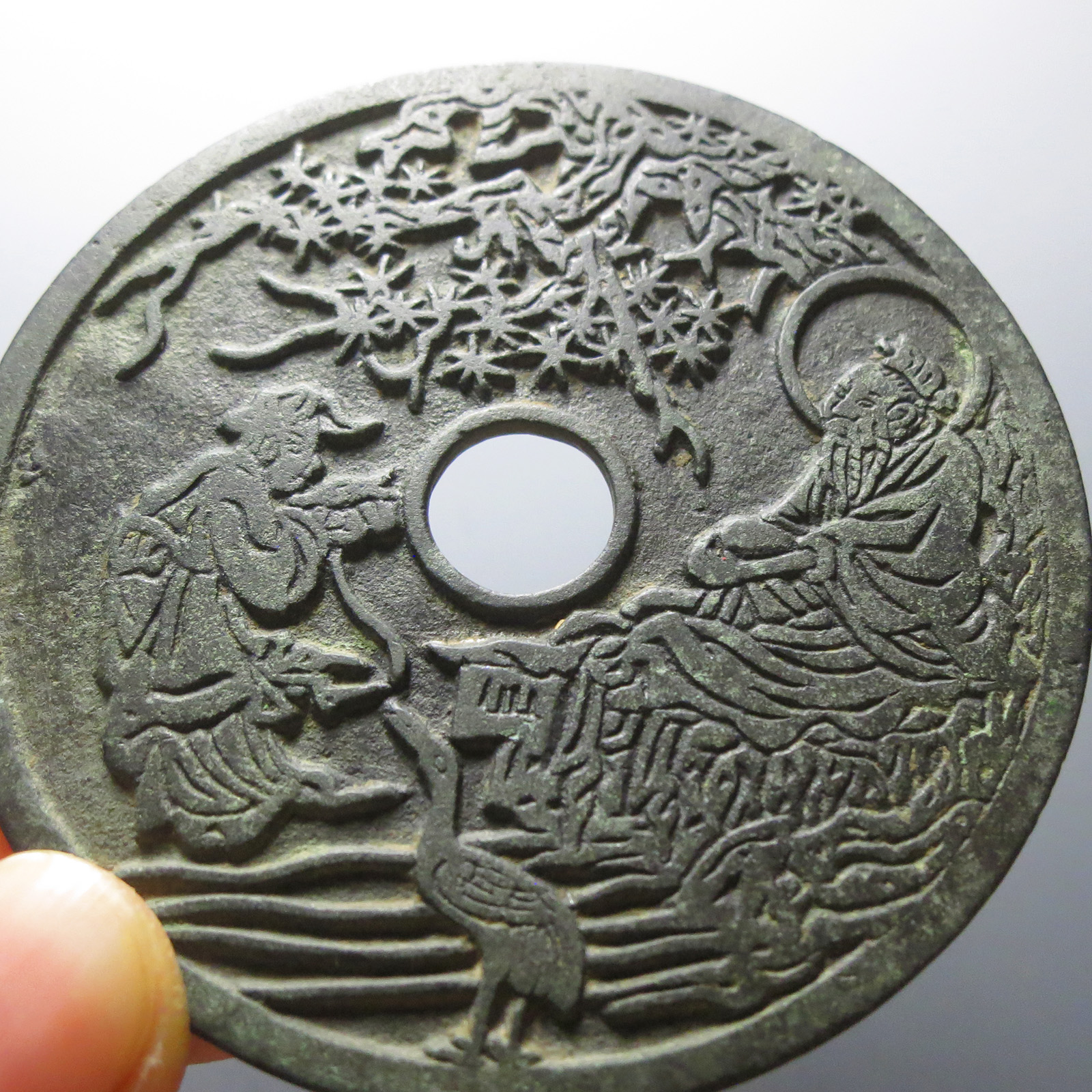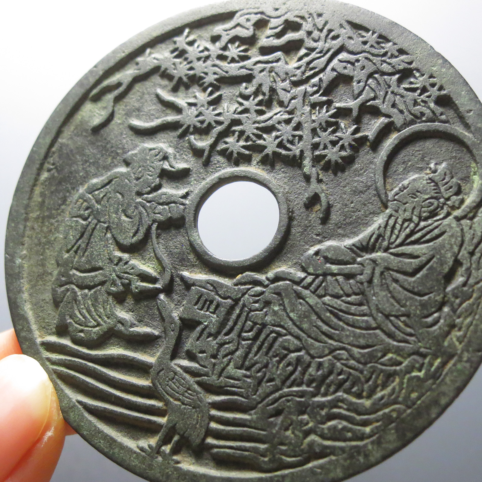 老子讲经背十二生肖花钱,此钱传世品相,包浆漆古老辣,熟美自然,头版头模,藏者所见最大直径,藏品保持非常完好!藏者所见最美!画面整体布局,十分饱满,线条清晰流畅,一面人物故事,穿右松下老者,老者面部、衣皱细节入微,穿左童子躬身面向老者,穿下仙鹤,姿态悠然祥和,细节入微,俨然一副精彩绝伦的铜版画,画面极具视听性,引人入境!一面生肖地支,间穿缠枝纹布局,十分考究,极具代表性,一步到位的藏品,潜力大,推荐收藏!!!!