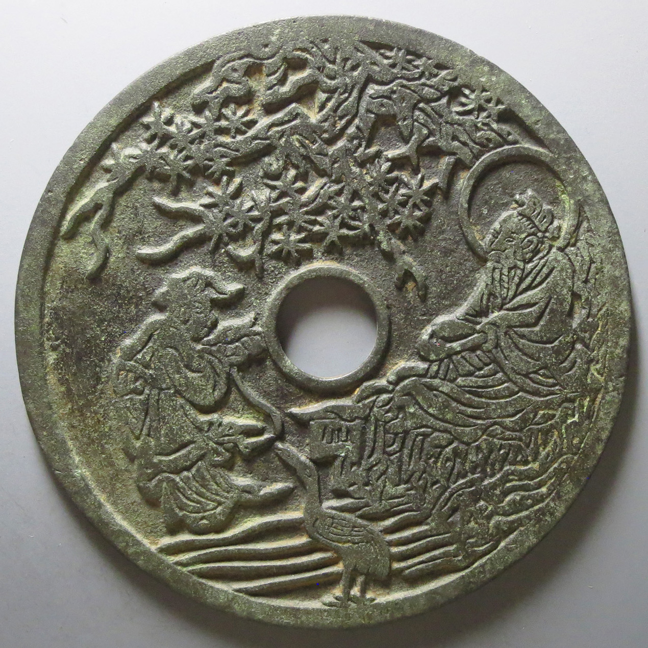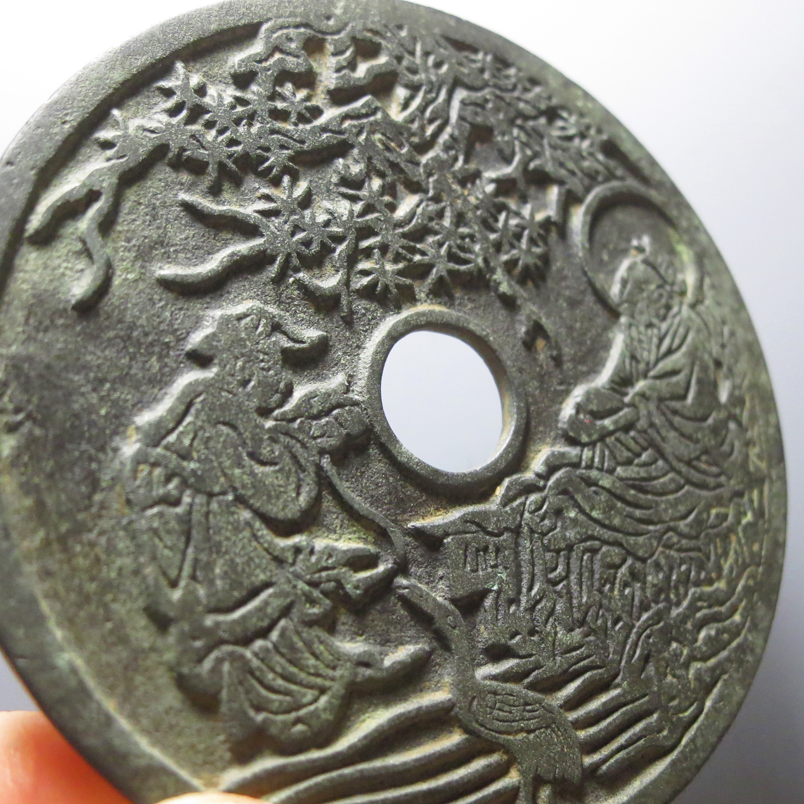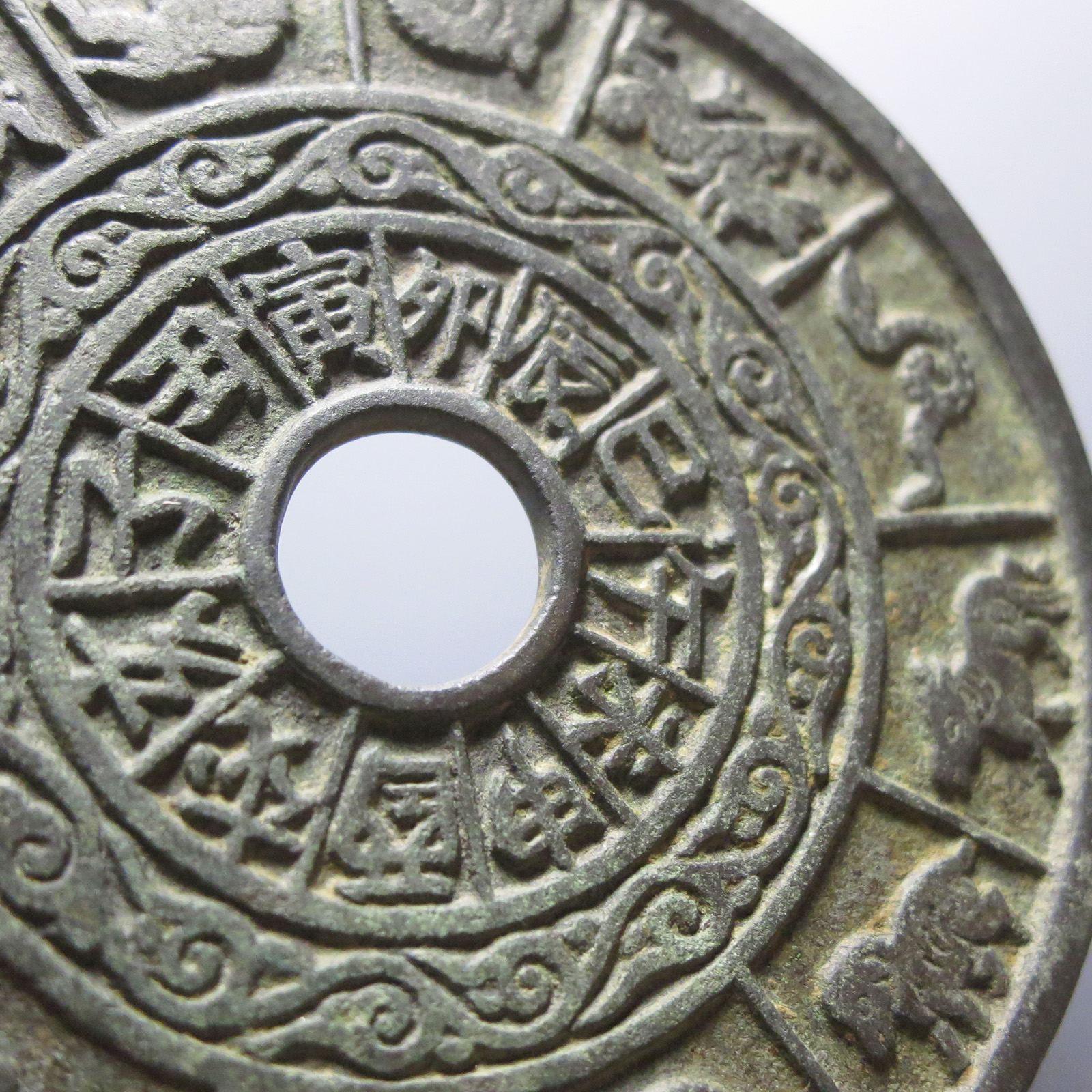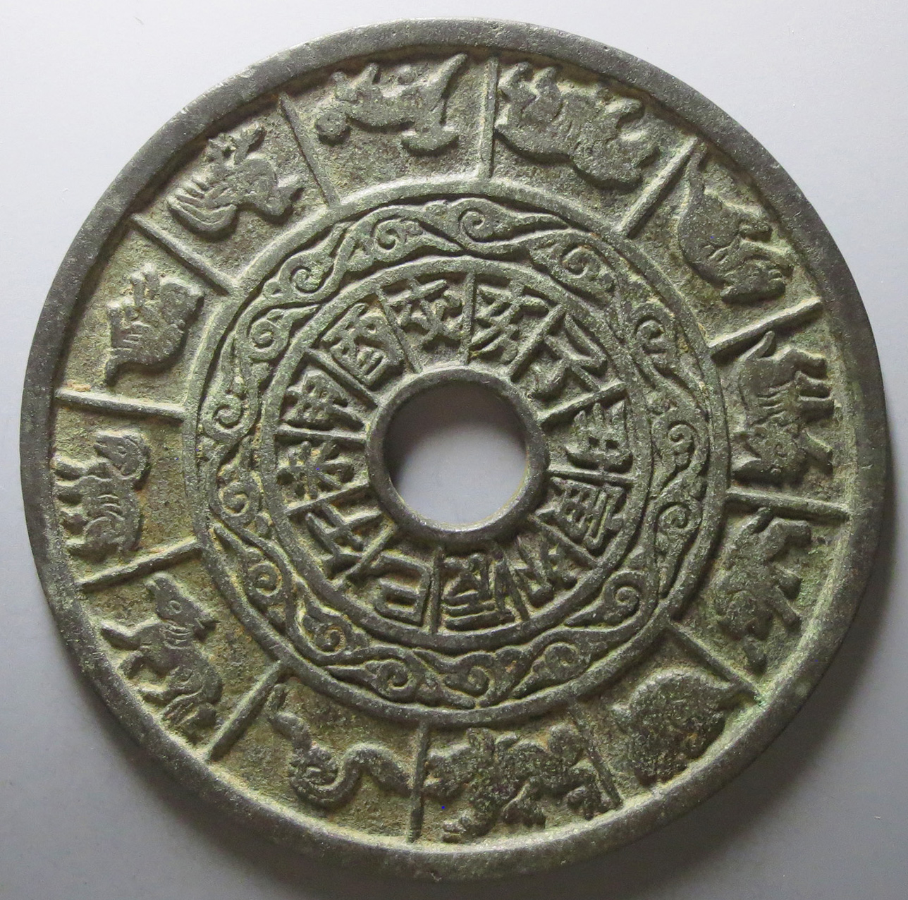 老子讲经背十二生肖花钱,此钱传世品相,包浆漆古老辣,熟美自然,头版头模,藏者所见最大直径,藏品保持非常完好!藏者所见最美!画面整体布局,十分饱满,线条清晰流畅,一面人物故事,穿右松下老者,老者面部、衣皱细节入微,穿左童子躬身面向老者,穿下仙鹤,姿态悠然祥和,细节入微,俨然一副精彩绝伦的铜版画,画面极具视听性,引人入境!一面生肖地支,间穿缠枝纹布局,十分考究,极具代表性,一步到位的藏品,潜力大,推荐收藏!!!!