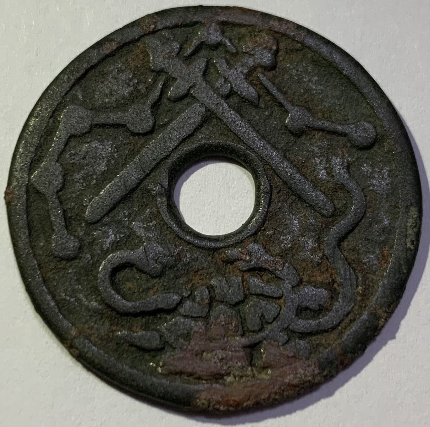 图录号035 十二生肖背玄武七星剑花钱 质地:铜 质量:9.0g 尺寸:33.5x33.5x1.6mm 十二生肖背龟蛇七星剑 ,版模一流,乌龟和蛇的线条流畅,80分盒子币。以龟蛇七星剑为主题的花钱,常见于民俗钱币的背面,或用于衬托主题,龟蛇纹饰为玄武。《左传》:“玄武在北方也。龟、蛇二虫共为玄武,故蛇是玄武之宿,虚危之星也。”玄武谓龟蛇,位在北方,故曰玄,身有鳞甲,是代表北方七宿的北方之神,道教将其吸纳为护法神,称执冥神君,后为真武大帝。龟蛇纹饰的寓意即为玄武在此,玄武护佑。七星,从纹饰构图来看,应该是北斗星,其依次为天枢、天璇、天玑、天权、玉衡、开阳、摇光,七星纹饰的寓意即为消灾解厄,寓意非常不错的道教题材压胜钱,值得入藏。
