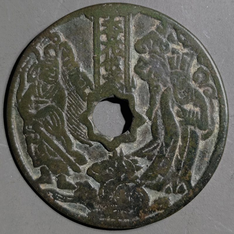 此钱为名誉品,传世品相,包浆温润自然,人物线条清晰。一面左边人物为真武,右边人物为二郎,均为古时道教中香火鼎盛的神仙;另一面为道教符文。值得收藏!