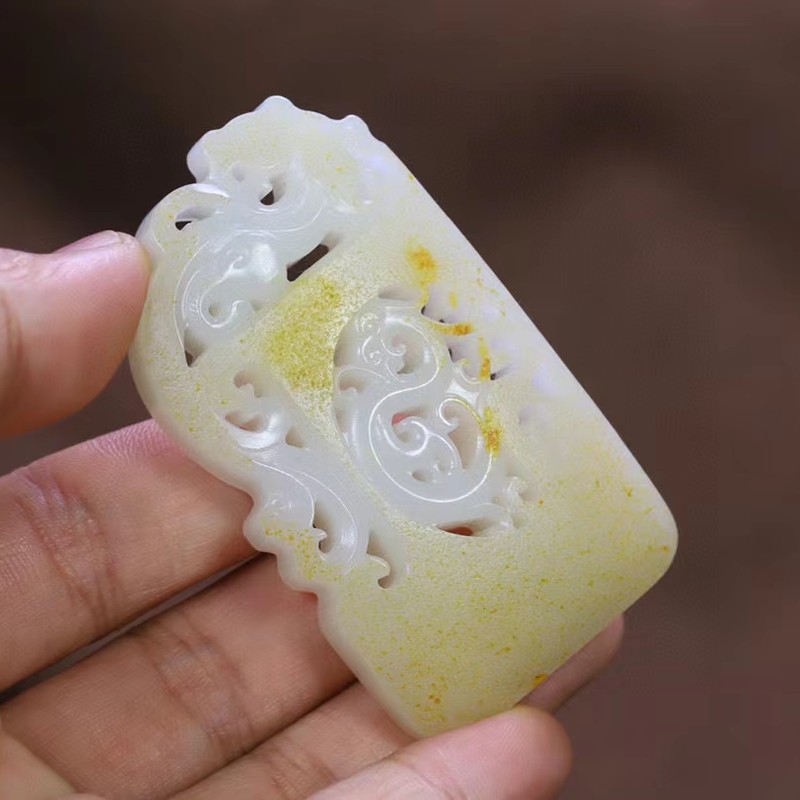 和田玉 俏色 龙凤呈祥 玉质细腻 工艺精美 威严肃穆 皮色漂亮 尺寸69*39*12毫米 重量65克。和田玉,“*四大名玉”之一(其三为陕西蓝田玉、辽宁岫玉和河南独山玉)。传统狭义范畴特指新疆和田地区出产的玉石,以和田“子料”为代表闻名于世;广义的和田玉指软玉(真玉)。和田玉虽然因新疆和田而命名,但其本身不是地域概念,并非特指新疆和田地区出产的玉,而是一类产品的名称。*把透闪石成份占98%以上的石头都命名为和田玉,都在国标范围内。