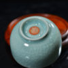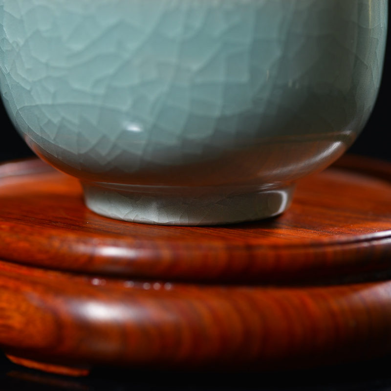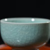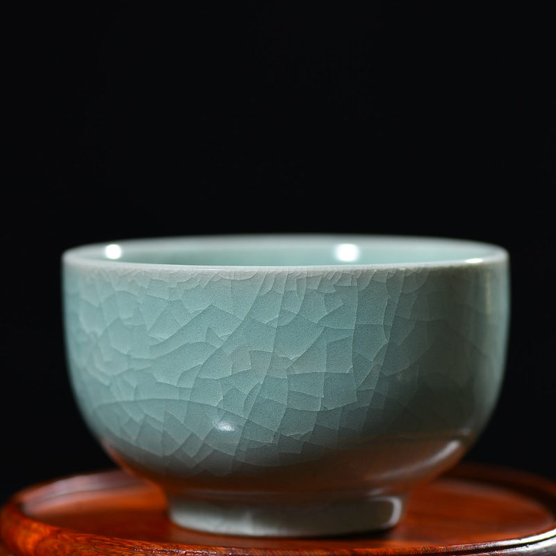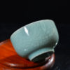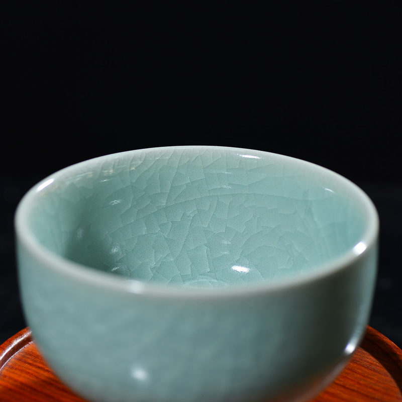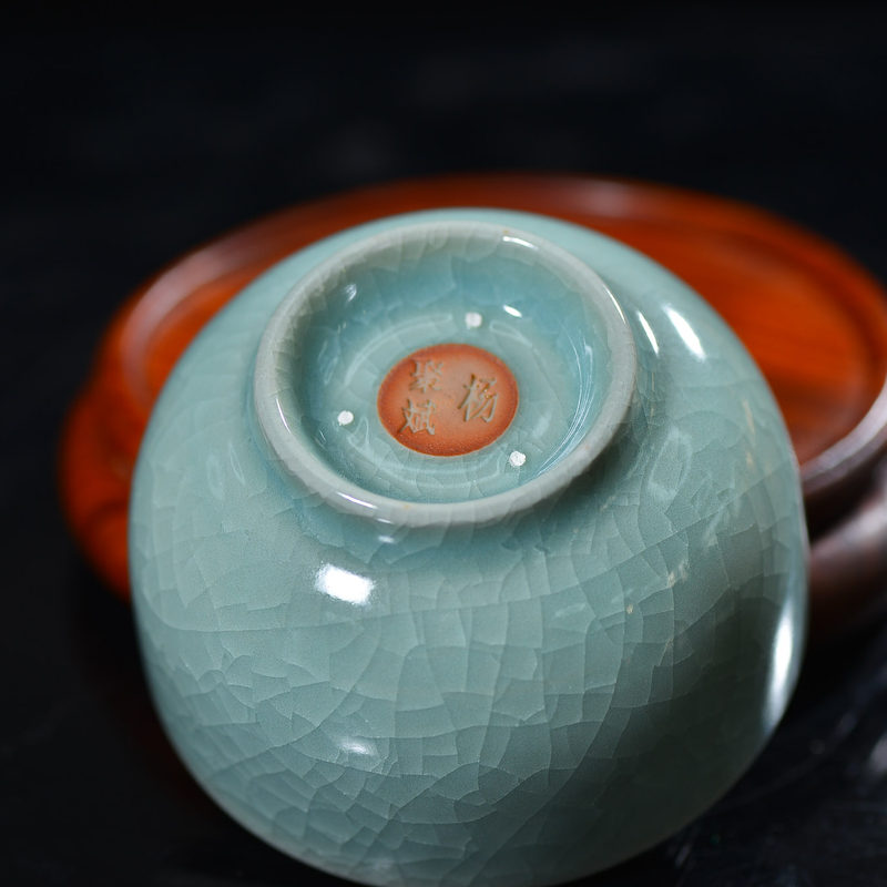汝瓷 冰裂釉 主人杯 尺寸4.5*7.5厘米。作者杨聚斌出生于1962年2月,因为父亲在陵头陶瓷厂工作,因此杨聚斌自幼受父亲耳濡目染,从少年时代就形成了陶瓷情结。1980年正式进入陵头陶瓷厂工作,开始系统学习陶瓷的烧制、配釉、造型、手拉胚等陶瓷制作技术。1990年,杨聚斌受洛阳旅游局聘请,被聘任为洛阳旅游局钧瓷厂技术厂长。1994年,杨聚斌被汝州市政府招聘到汝州市汝瓷一厂担任技术科长。1997年,企业改制后,杨聚斌自己成立了杨聚斌汝瓷工作室。2015年6月,作品《百合洗》《鸡心碗》第五届中国"大地奖"金奖。
