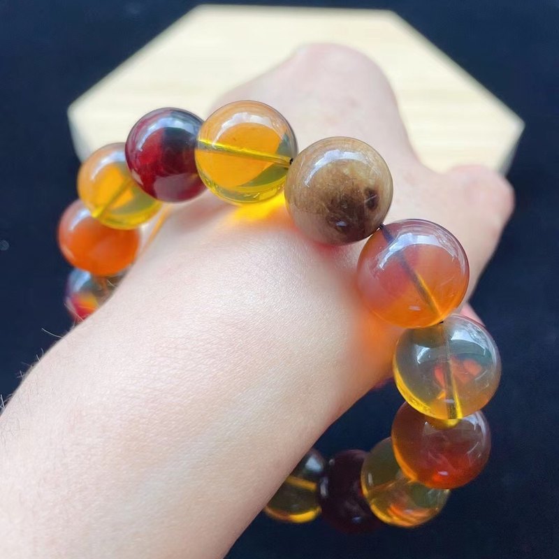 缅甸 多宝 琥珀 手串 无冰裂 个别微微一丝流纹, 直径15厘米 重量31克。琥珀,是一种透明的生物化石,是松柏科、云实科、南洋杉科等植物的树脂化石,树脂滴落,掩埋在地下千万年,在压力和热力的作用下石化形成,有的内部包有蜜蜂等小昆虫,奇丽异常。琥珀大多数由松科植物的树脂石化形成,故又被称为“松脂化石”。