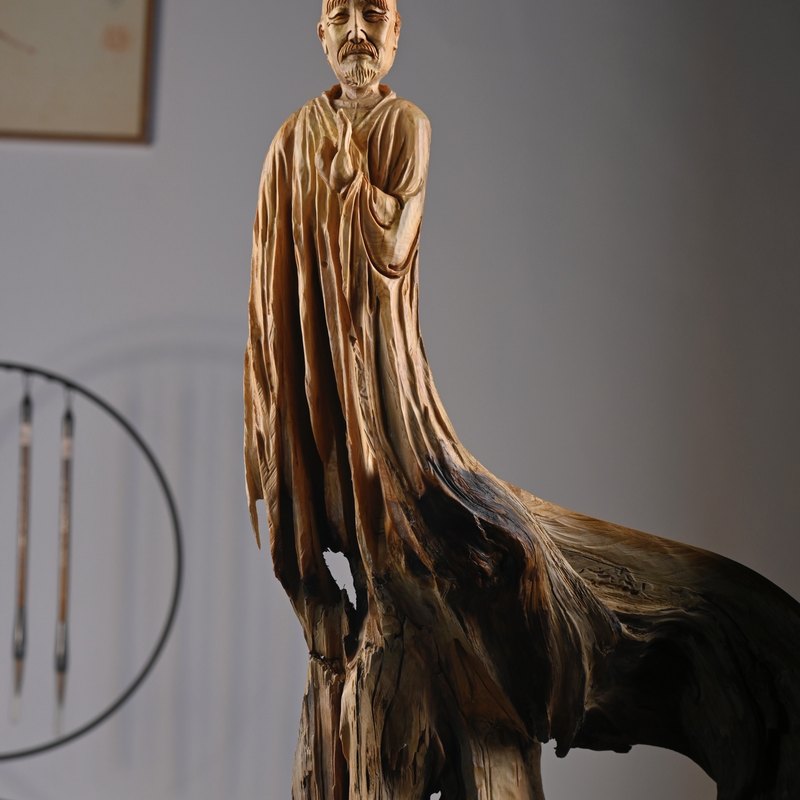 太行山崖柏 弘一法师 陈化老料 柏香浓郁 雕工精湛 长33厘米 宽22厘米 高60厘米 重量12斤。崖柏全国有,太行料为尊。太行料之所以好,主要因为崖柏太行料的香味更佳的醇厚,沁人心脾,尤其是太行老料,这是在山崖经过百年千年的自然风化而留下来的珍贵之宝;其二,由于地理环境的关系,崖柏太行料比其他地区的品质要好一些,料子的密度更高而且木质的质感更加细腻,老料一般都是干透的,所以密度值是实打实的。
