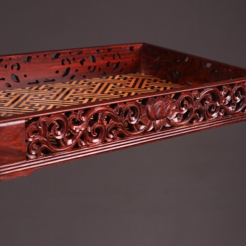 印度小叶紫檀 文承盘 榫卯结构 差昂28厘米 宽20厘米 高4.5厘米。紫檀原产于印度,在中国分布于台湾、广东和云南,在印度、菲律宾、印度尼西亚和缅甸也有分布。 [11] 紫檀对环境有较强的适应能力,常生于坡地疏林中或栽培于庭园,对土壤不苛求,其根系发达,具根瘤,能固氮,喜强光,生长快,再生力强。紫檀的繁殖方式是扦插繁殖和播种繁殖。