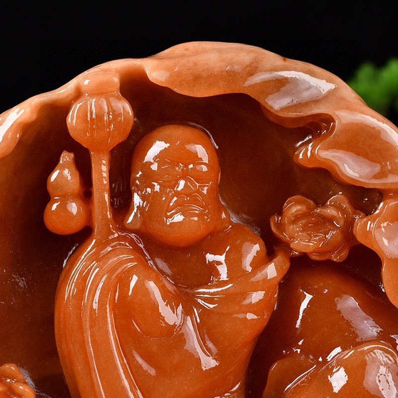 寿山石 骑象罗汉 完美质地 色泽温润 福建省福州市晋安区特产,中国国家地理标志产品。寿山石是中华瑰宝,中国传统“四大印章石“之一。分布在福州市北郊晋安区与连江县、罗源县交界处的“金三角”地带。寿山石是福州特有的名贵石材,其石质晶莹、脂润、色彩斑斓,色泽浑然天成,色界分明,具有稀有性、人文性和升值性的特点,深受国内外人士的喜爱,并于2003年被确定为“国石”候选石。若以矿脉走向,又可分为高山、旗山、月洋三系。因为寿山矿区开采得早,旧说的“田坑、水坑、山坑”,就是指在此矿区的田底、水涧、山洞开采的矿石。经过1500年的采掘,寿山石涌现的品种达百数十种之多。 2010年09月30日,原国家质检总局批准对“寿山石”实施地理标志产品保护。