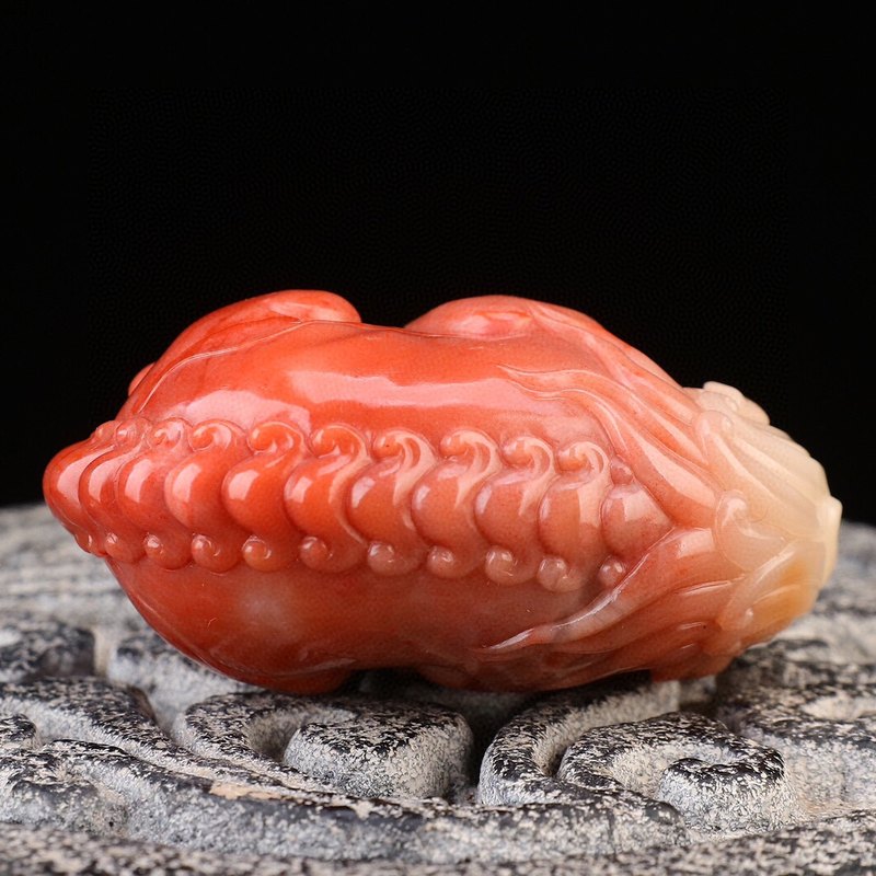 寿山石 招财貔貅 完美质地 色泽温润 精雕细琢 长5厘米 宽3.5厘米 高8厘米 重量0.4斤。福建省福州市晋安区特产,中国国家地理标志产品。寿山石是中华瑰宝,中国传统“四大印章石“之一。分布在福州市北郊晋安区与连江县、罗源县交界处的“金三角”地带。寿山石是福州特有的名贵石材,其石质晶莹、脂润、色彩斑斓,色泽浑然天成,色界分明,具有稀有性、人文性和升值性的特点,深受国内外人士的喜爱,并于2003年被确定为“国石”候选石。若以矿脉走向,又可分为高山、旗山、月洋三系。因为寿山矿区开采得早,旧说的“田坑、水坑、山坑”,就是指在此矿区的田底、水涧、山洞开采的矿石。经过1500年的采掘,寿山石涌现的品种达百数十种之多。 2010年09月30日,原国家质检总局批准对“寿山石”实施地理标志产品保护。