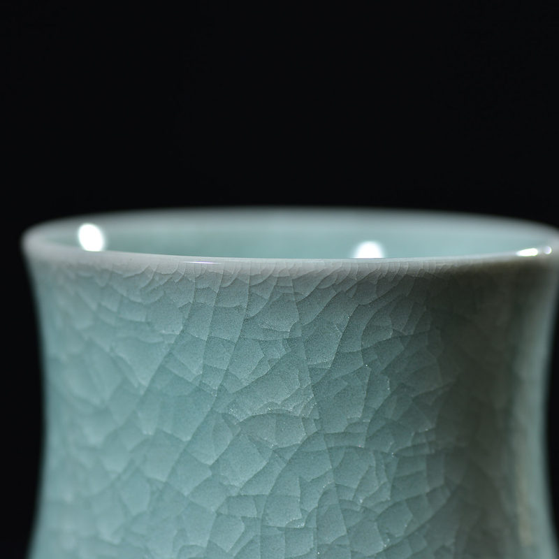 汝瓷 冰裂釉 主人杯 尺寸5.5*7厘米。作者杨聚斌出生于1962年2月,因为父亲在陵头陶瓷厂工作,因此杨聚斌自幼受父亲耳濡目染,从少年时代就形成了陶瓷情结。1980年正式进入陵头陶瓷厂工作,开始系统学习陶瓷的烧制、配釉、造型、手拉胚等陶瓷制作技术。1990年,杨聚斌受洛阳旅游局聘请,被聘任为洛阳旅游局钧瓷厂技术厂长。1994年,杨聚斌被汝州市政府招聘到汝州市汝瓷一厂担任技术科长。1997年,企业改制后,杨聚斌自己成立了杨聚斌汝瓷工作室。2015年6月,作品《百合洗》《鸡心碗》第五届中国"大地奖"金奖。
