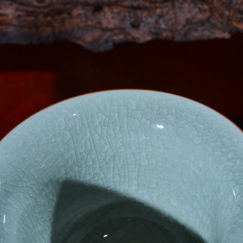 汝瓷 天青釉 三才盖碗,采用汝州本地天然原矿石,研磨精工制作而成,密封好,设计巧妙,开片精美 。是居家摆放收藏馈赠佳品。汝瓷—中国五大名瓷之一,创烧于北宋晚期,为宫廷御用瓷器。金灭北宋后,汝瓷也随之消亡。其开窑时间前后只有二十年,由于烧造时间短暂,传世亦不多,在南宋时,汝瓷已经非常稀有。素有“家财万贯,不如汝瓷一片”。 作者杨聚斌出生于1962年2月,因为父亲在陵头陶瓷厂工作,因此杨聚斌自幼受父亲耳濡目染,从少年时代就形成了陶瓷情结。1980年,正式进入陵头陶瓷厂工作,开始系统学习陶瓷的烧制、配釉、造型、手拉胚等陶瓷制作技术。1990年,杨聚斌受洛阳旅游局聘请,被聘任为洛阳旅游局钧瓷厂技术厂长。1994年,杨聚斌被汝州市政府招聘到汝州市汝瓷一厂担任技术科长。1997年,企业改制后,杨聚斌自己成立了杨聚斌汝瓷工作室。 2015年6月,作品《百合洗》《鸡心碗》荣获第五届中国“大地奖"金奖。被评为汝瓷烧制非物质文化遗产传承人。 口径:9.5cm 高:5.8cm 容量约:220mL